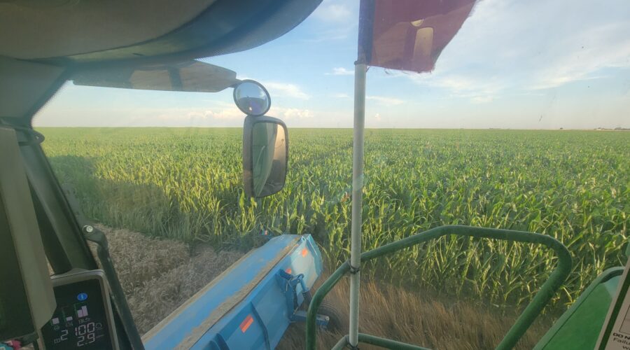 We are the last harvester in town. We’ll hopefully finish up here today or tomorrow with five combines still here. Three more combines joined for a few days but left July 17 to go to western Nebraska. They unloaded and went straight to the field and are cutting.