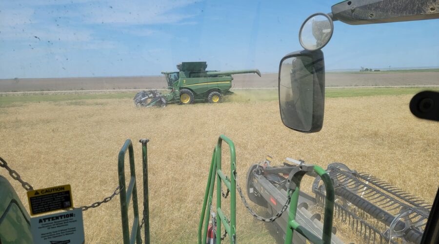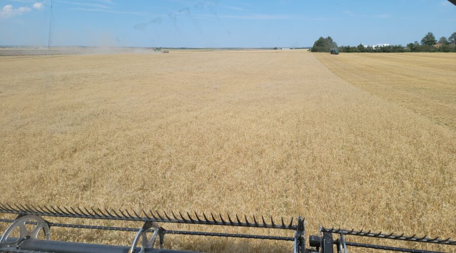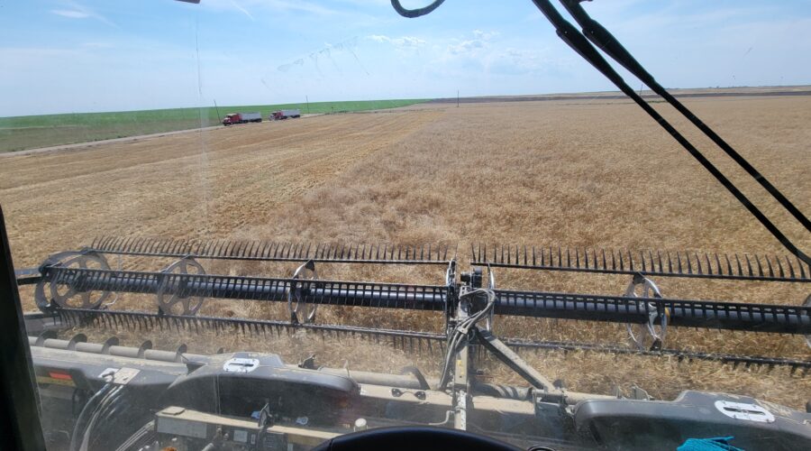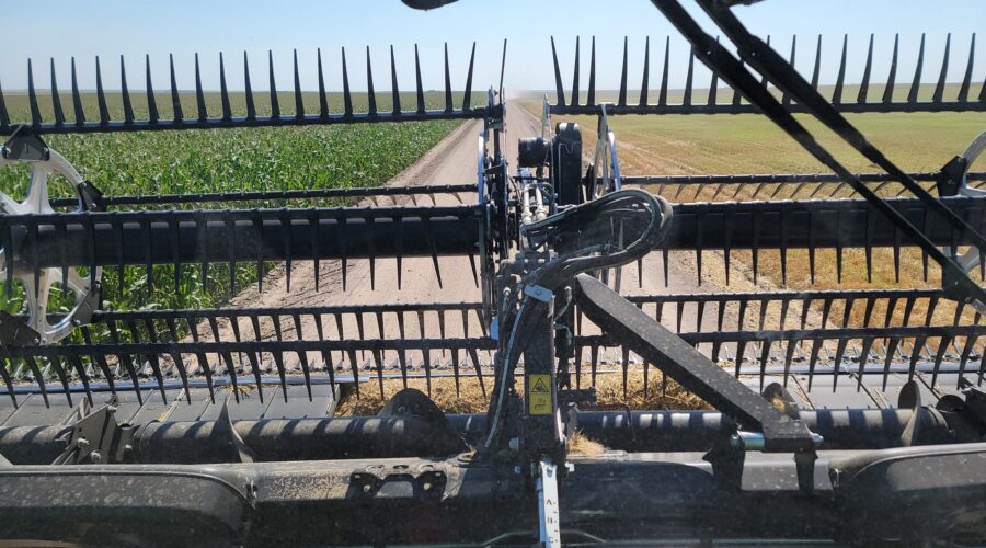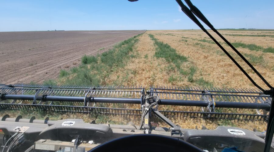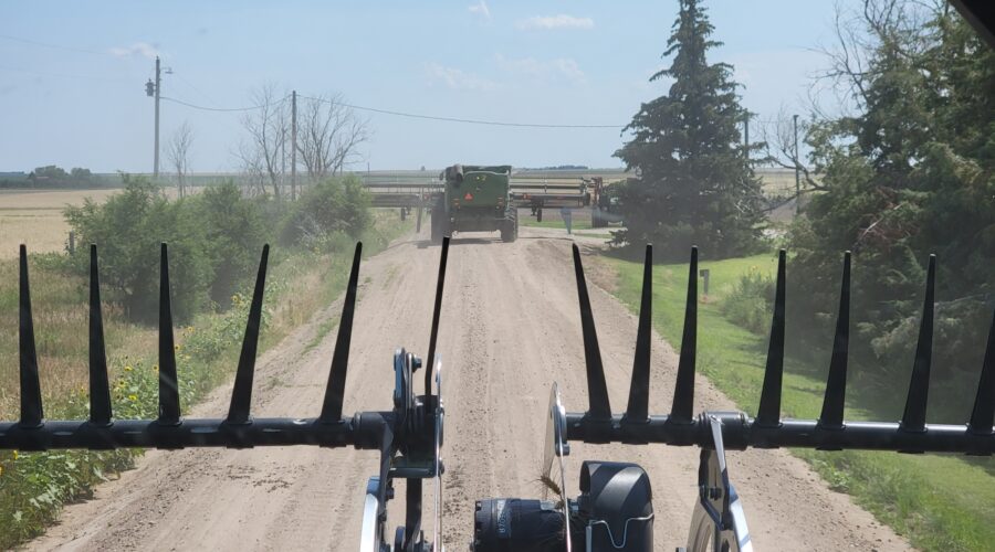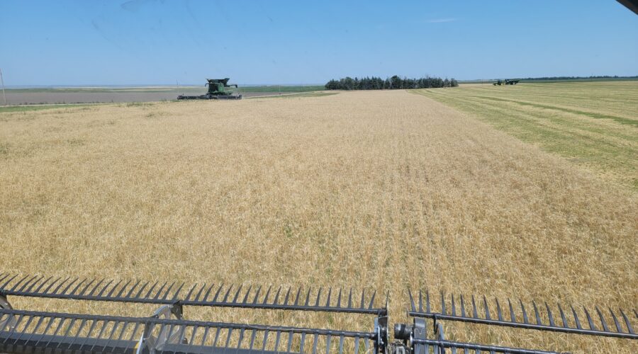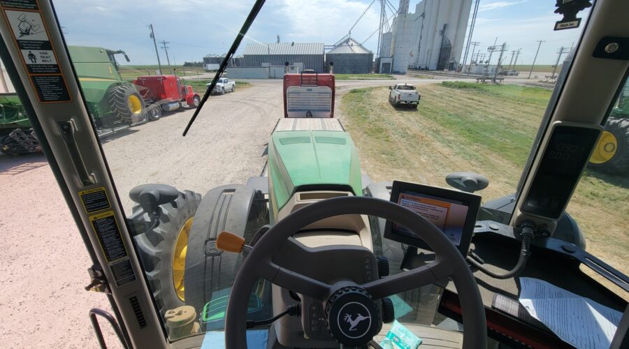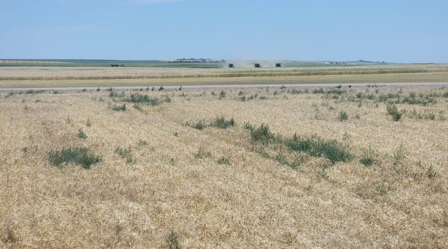 We made it to the farm on July 19, unloaded and we’ve been staying very busy in the wheat fields. However, the conditions are tough. There’s lots of sawfly and tough straw again this year here in Nebraska. The headers plug up and the combines sometimes do too. I wonder if fungicide or a spray creates the toughness? The wheat so far is averaging 35 to 50 bushels per acre. The test weights around 59 pounds per bushel. The moisture has been running dry around only 9%.