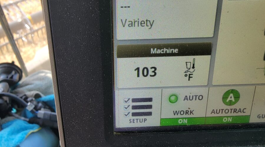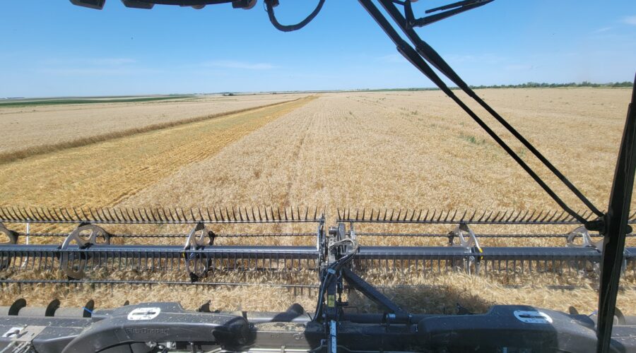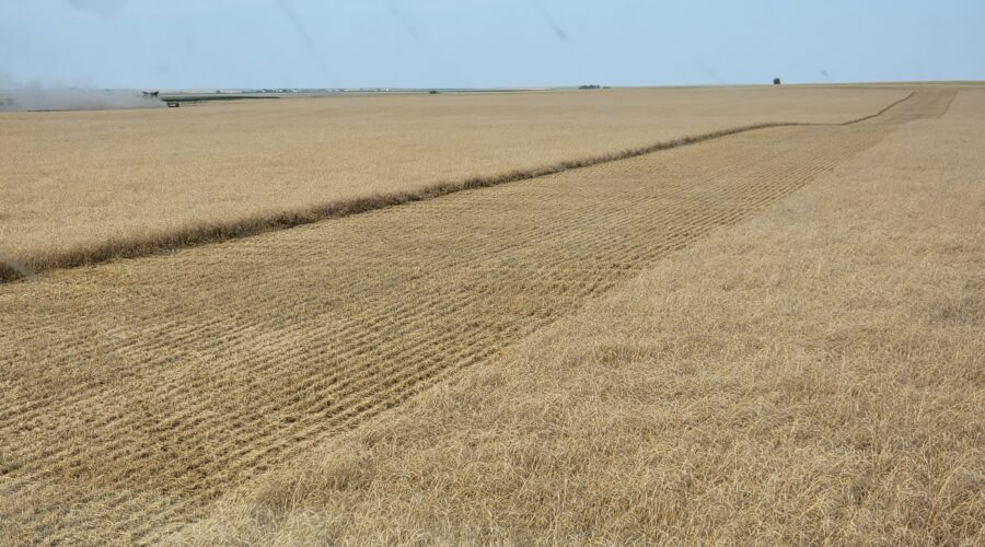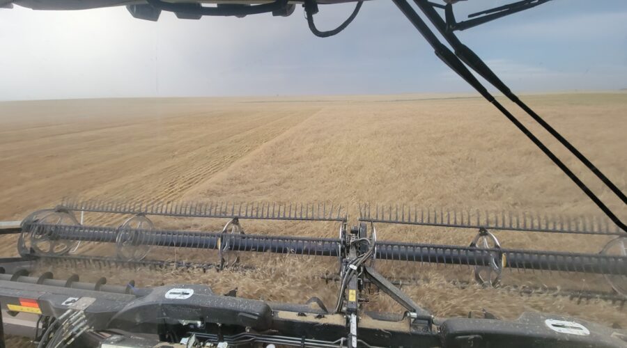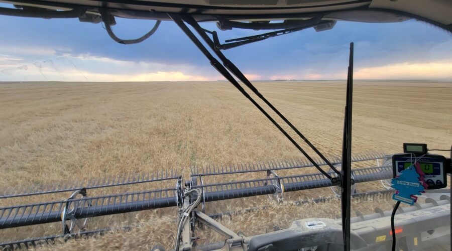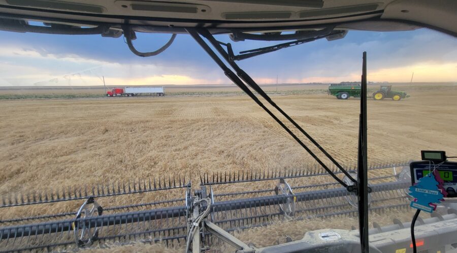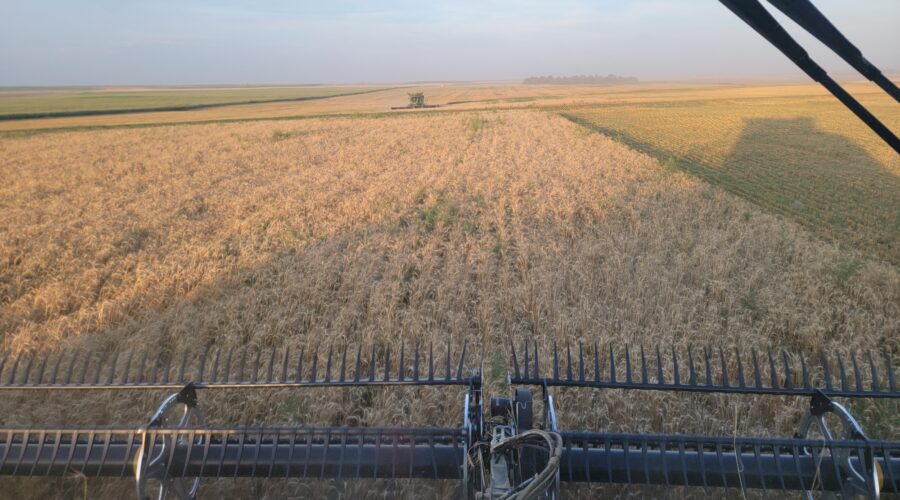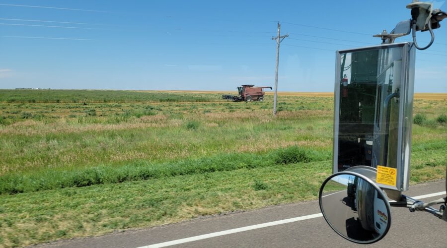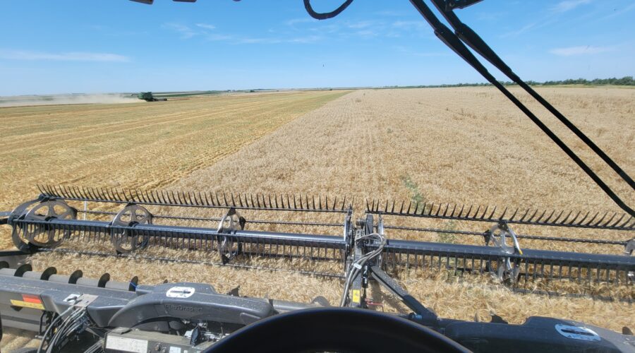 We made it to the farm on July 19, unloaded and we’ve been staying very busy in the wheat fields. However, the conditions are tough. There’s lots of sawfly and tough straw again this year here in Nebraska. The headers plug up and the combines sometimes do too. I wonder if fungicide or a spray creates the toughness? The wheat so far is averaging 35 to 50 bushels per acre. The test weights around 59 pounds per bushel. The moisture has been running dry around only 9%.