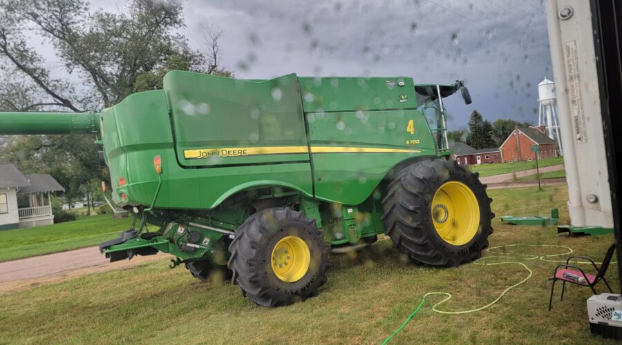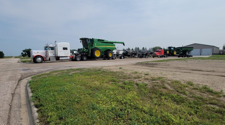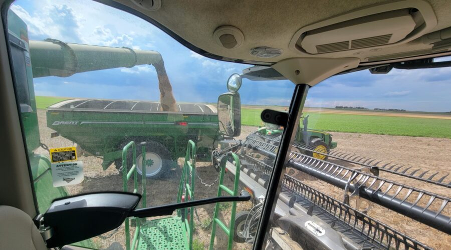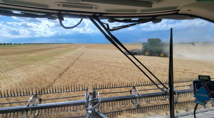 The winter wheat looks like a 30 bushel crop. The spring wheat looks better. The canola looks great. We came all the way up from western Nebraska. The wheat yielded good there. We stayed busy until the forecast changed. It’s been cool and raining off and on for days. South Dakota has a poor spring wheat crop that’s super late so we didn’t get to cut there this year. It’s amazing how there can be such extremes year to year. Last year I cut 97 bushel spring wheat in South Dakota.