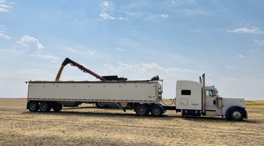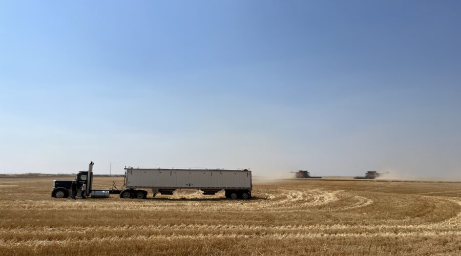 Without a grain cart, combines were dumping directly into the truck and two trucks easily kept up with two machines. While we have two carts still in the area, the wheat Paul’s cutting needs both carts to keep up.
