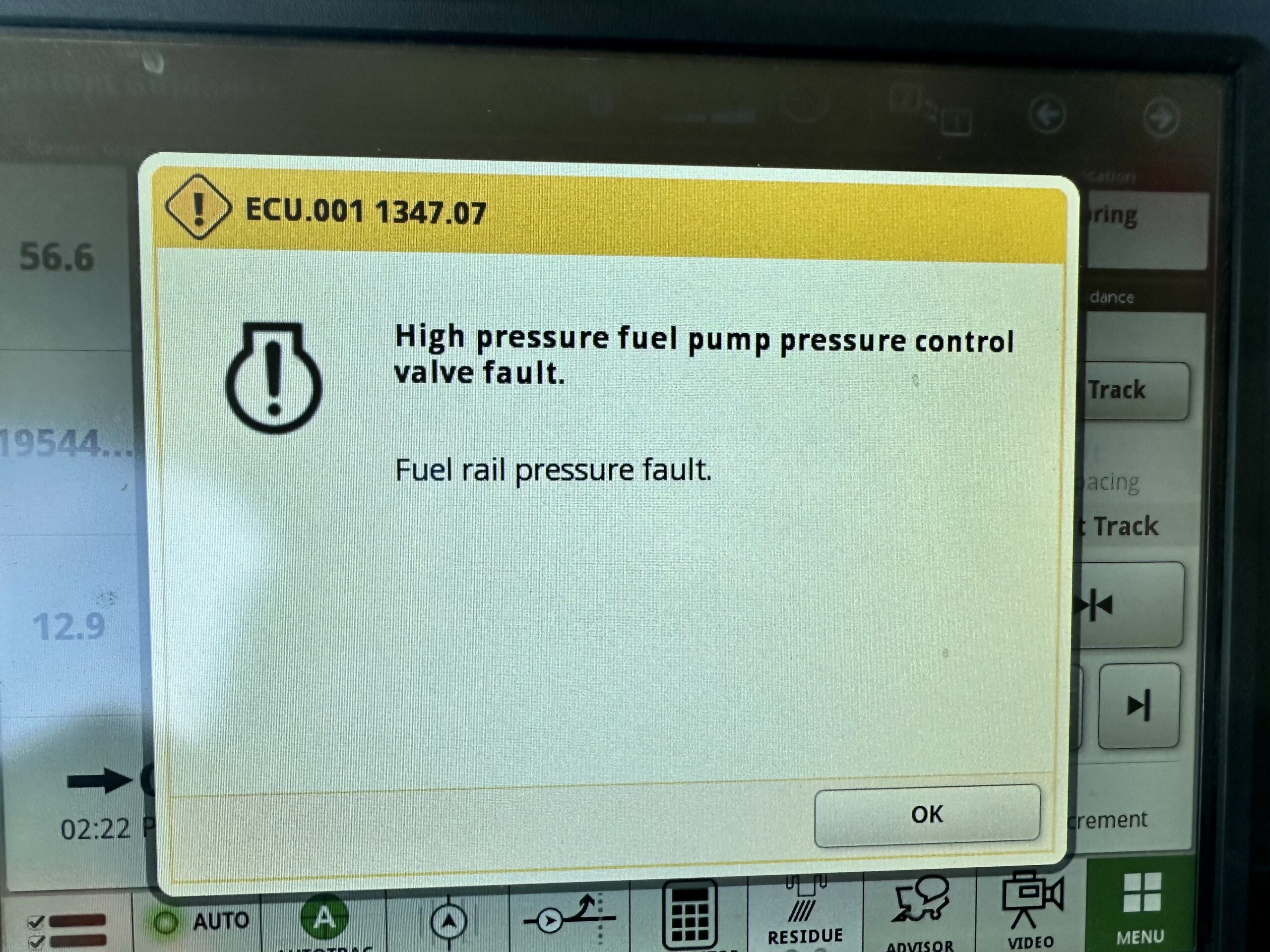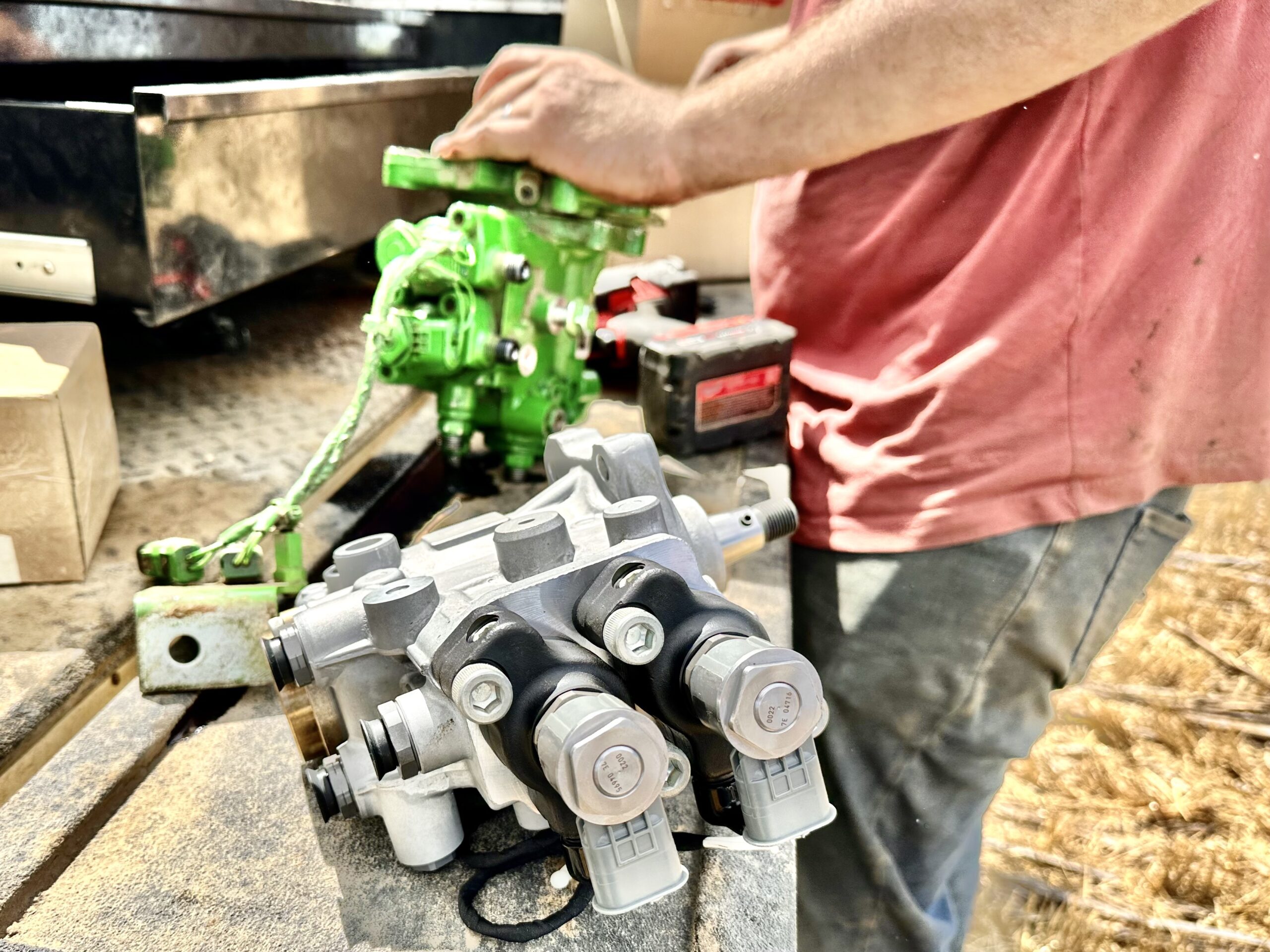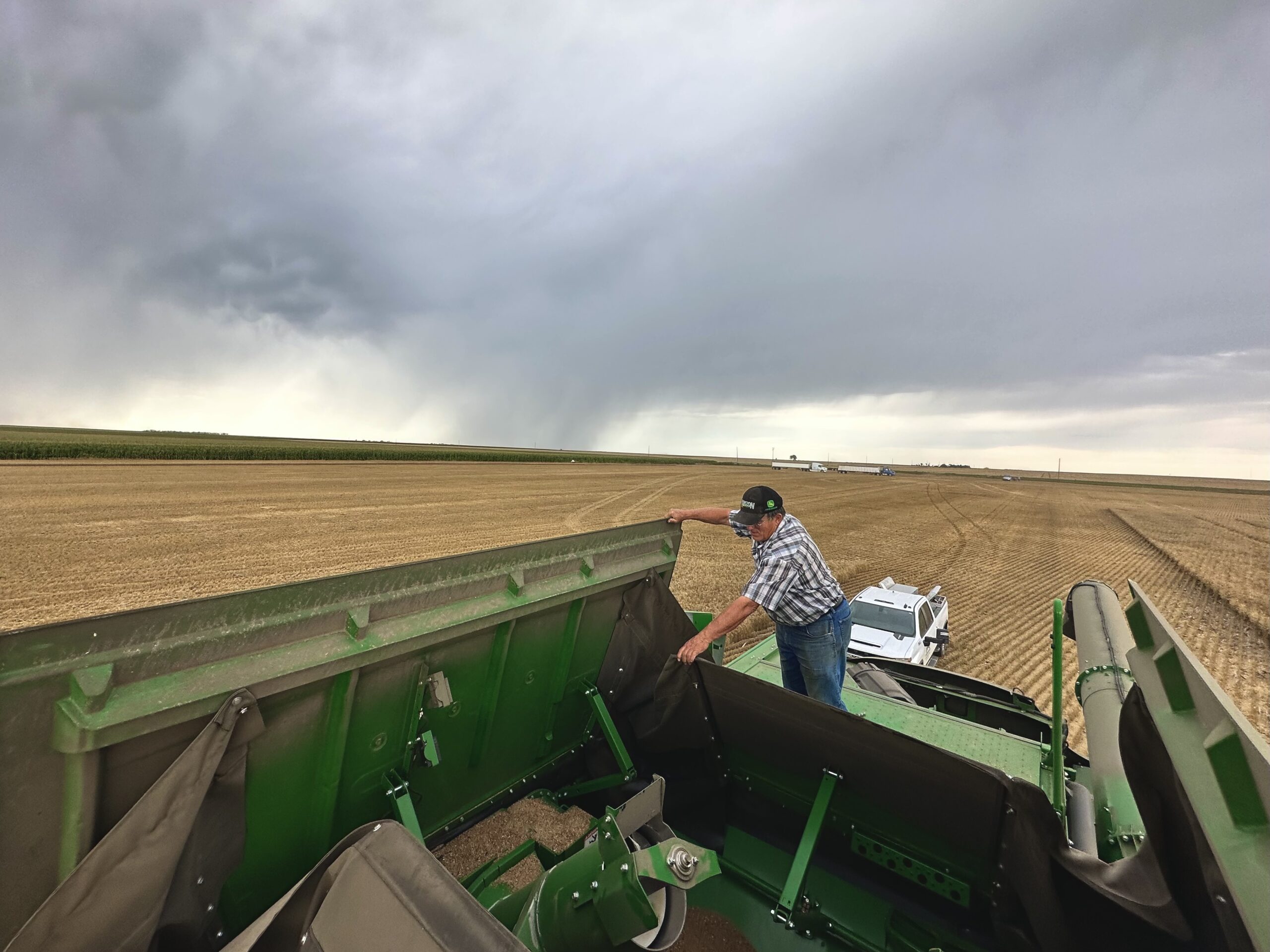 A low fuel pressure warning on my machine began to intermittently appear, so I placed a phone call to the factory Harvest Support team. While I was on the phone troubleshooting, the engine died and would not restart. After a few hours of inspecting the fuel system it became clear we were going to need an in-field service call to find the problem. Of course rain showers off in the distance were concerning since I had wheat still in the tank. The stress level went up as the raindrops came down and I can confirm it is possible to manually fold by hand the power grain tank covers without the engine running—but it’s not much fun.