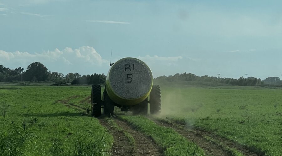 As the pickers are running, Wesson is moving the cotton bales to higher ground. He has moved about 60 bales out of the field, so that we can get to them to load them on our trailer to haul them to the gin.