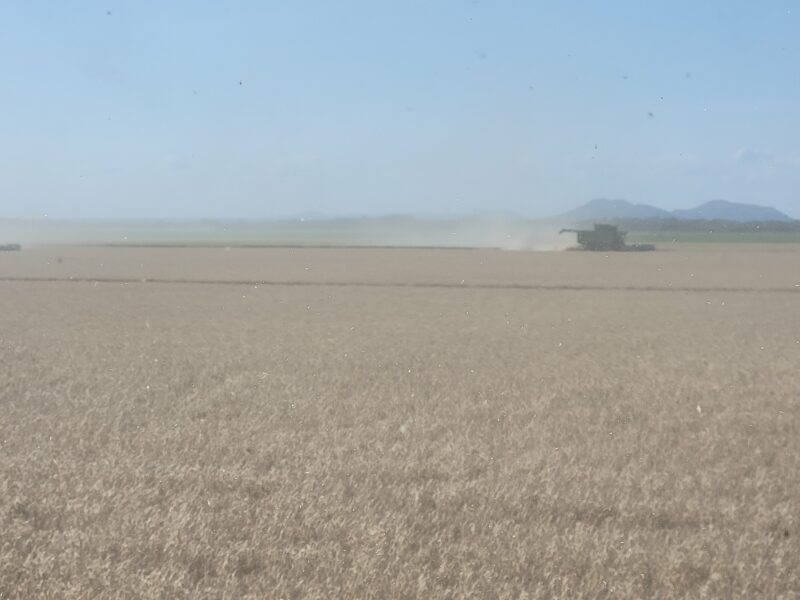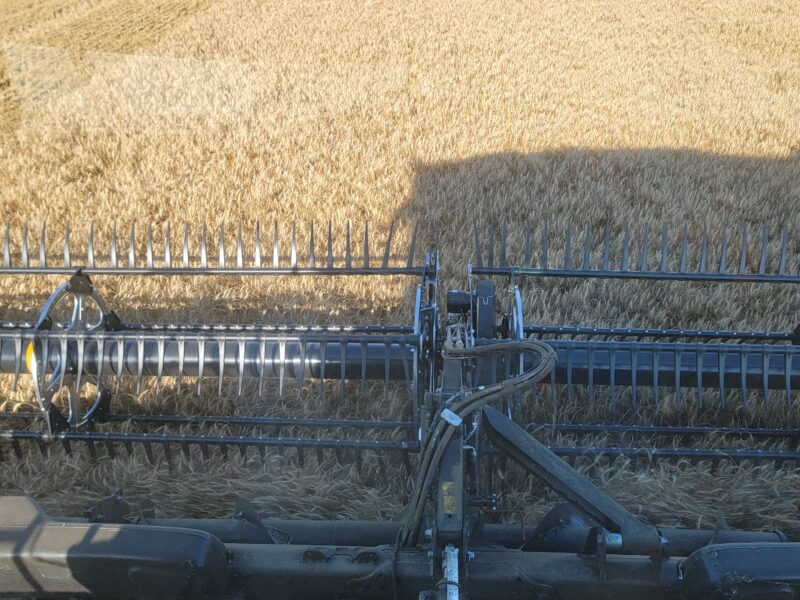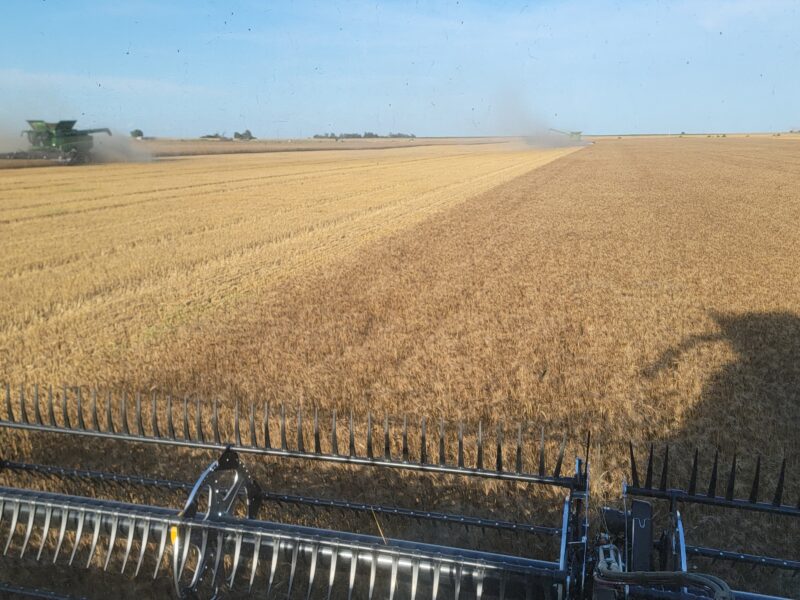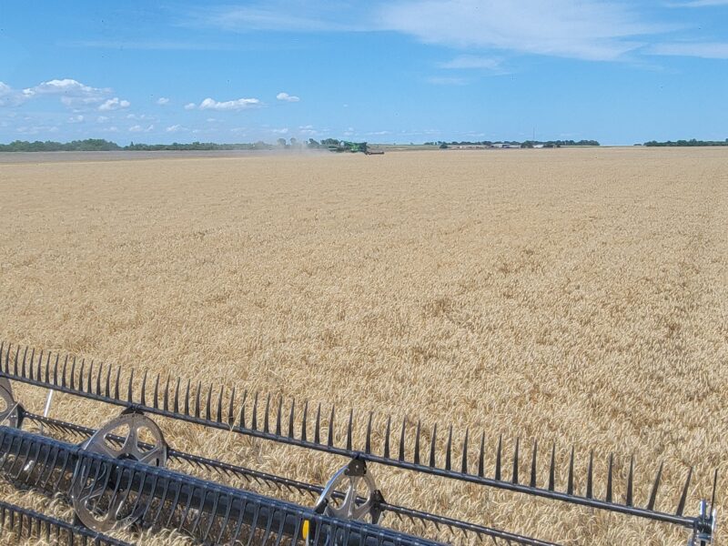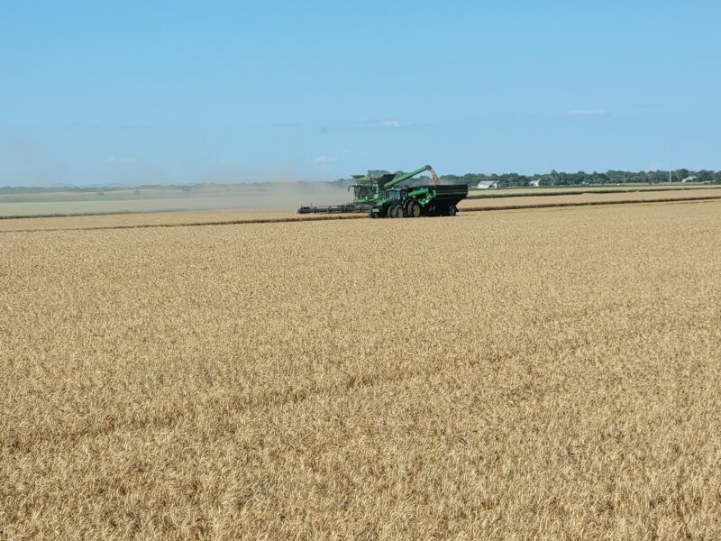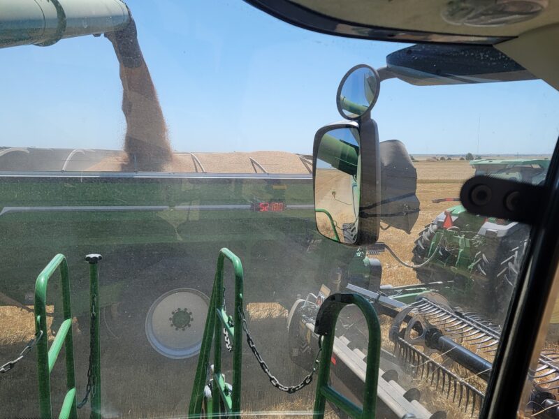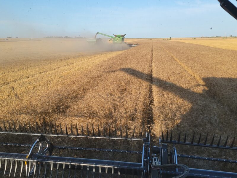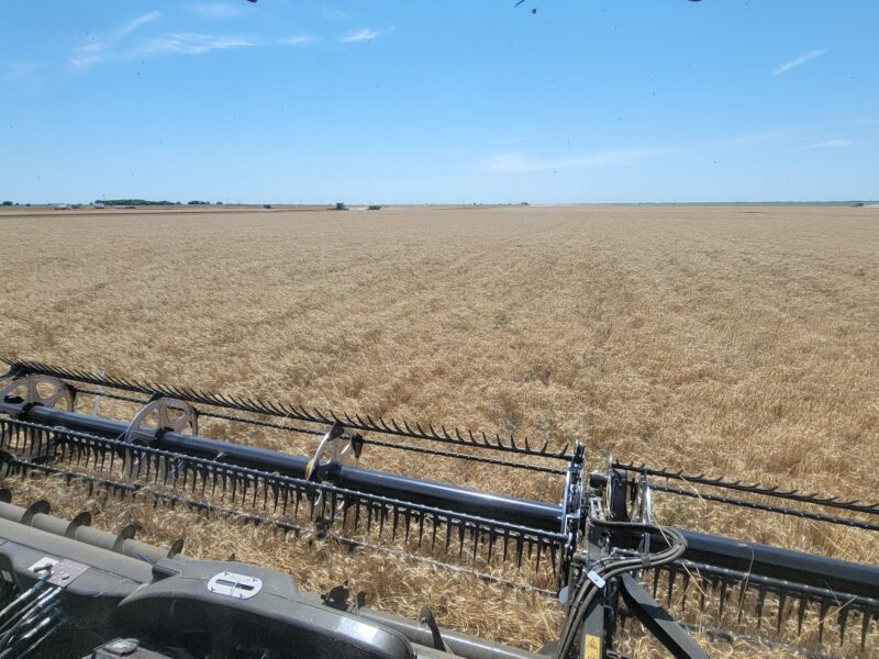 The wheat in this area has averaged around fifty bushels per acre. The test weights have been anywhere from 58 to 64 pounds per bushel. Overall, it’s been a very nice wheat crop to cut.