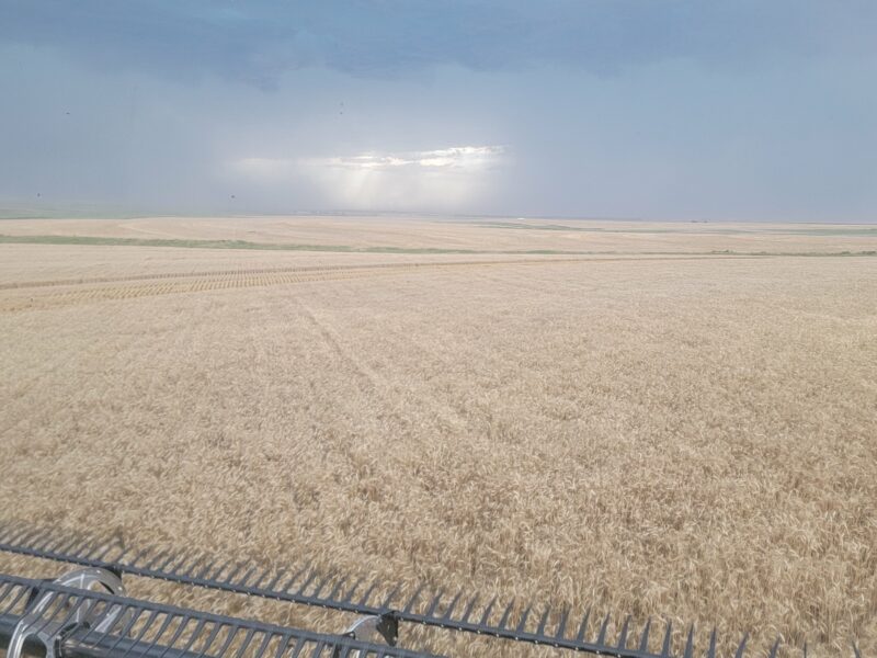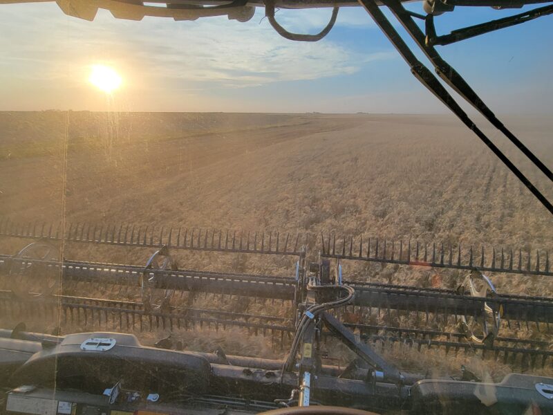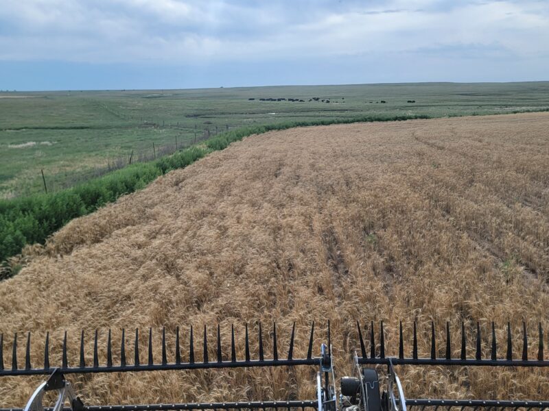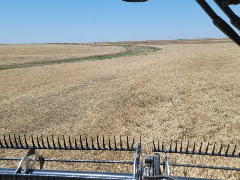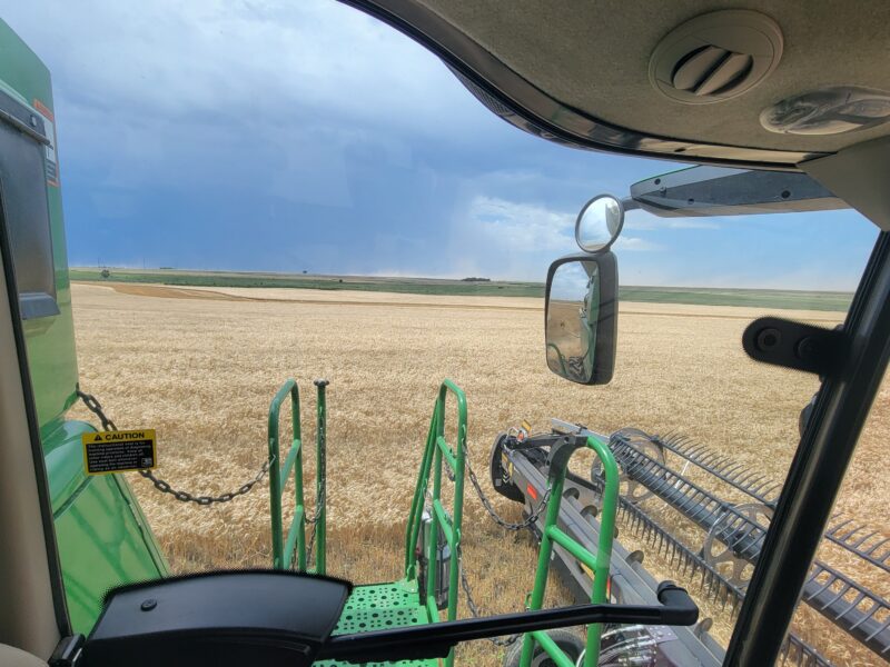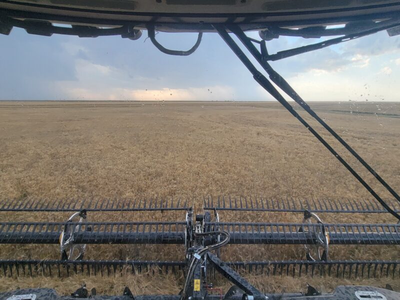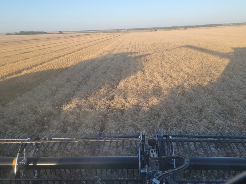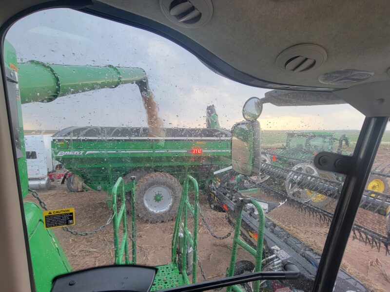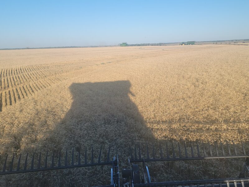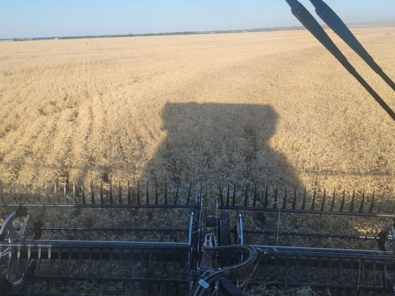 We’ve got four combines in southern Kansas and five combines moving from northern Oklahoma to western Kansas today. This is June 16, and it is Father’s Day. I have the greatest dad ever so “Happy Father’s Day!” We spent the day cutting wheat. The wheat here is averaging 30-45 bushels per acre. The test weights have been 59-60 pounds per bushel.