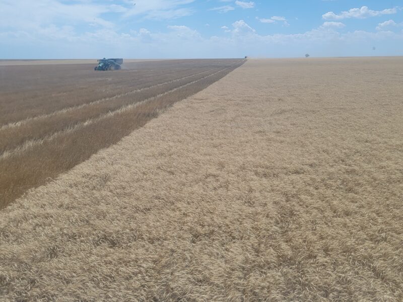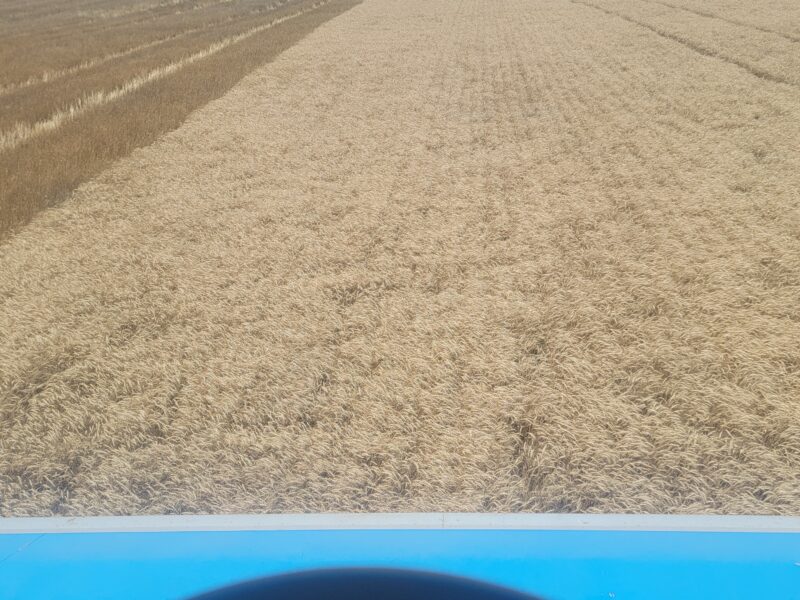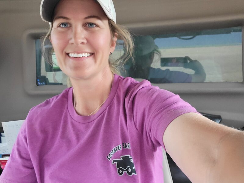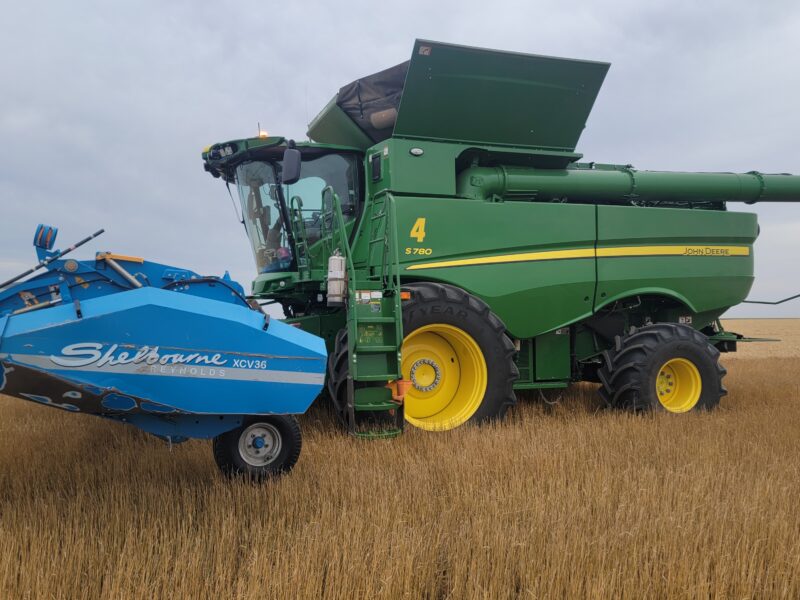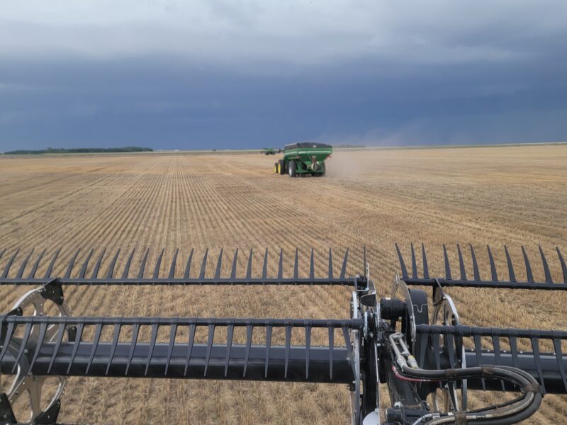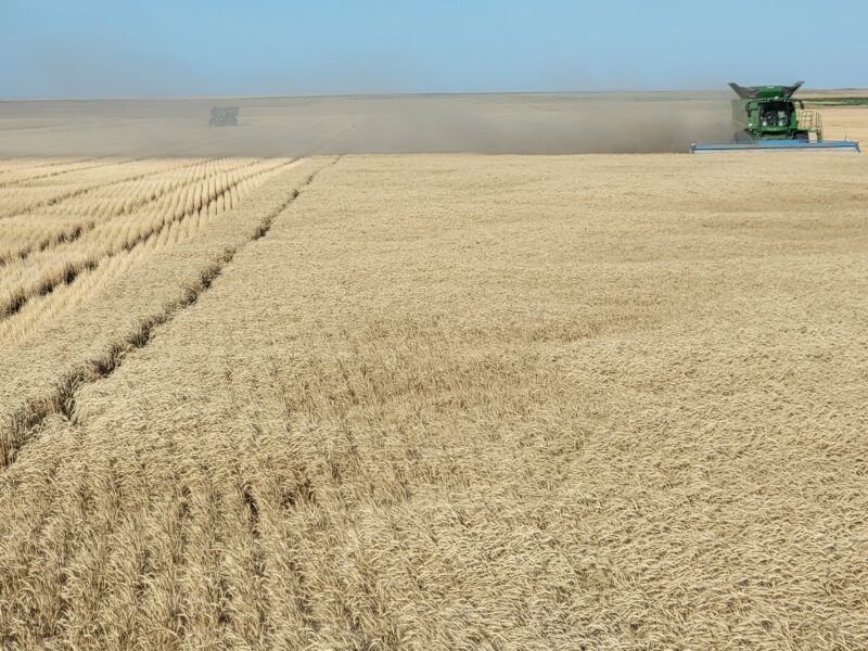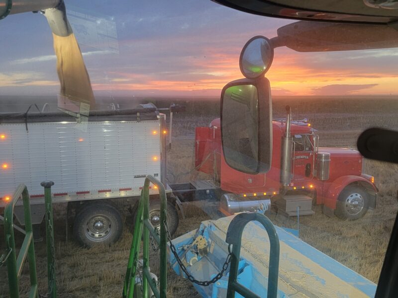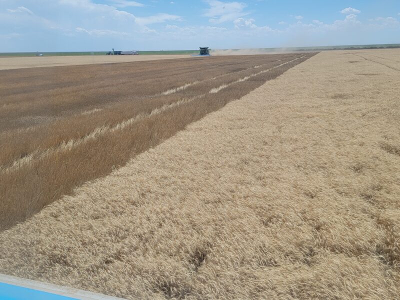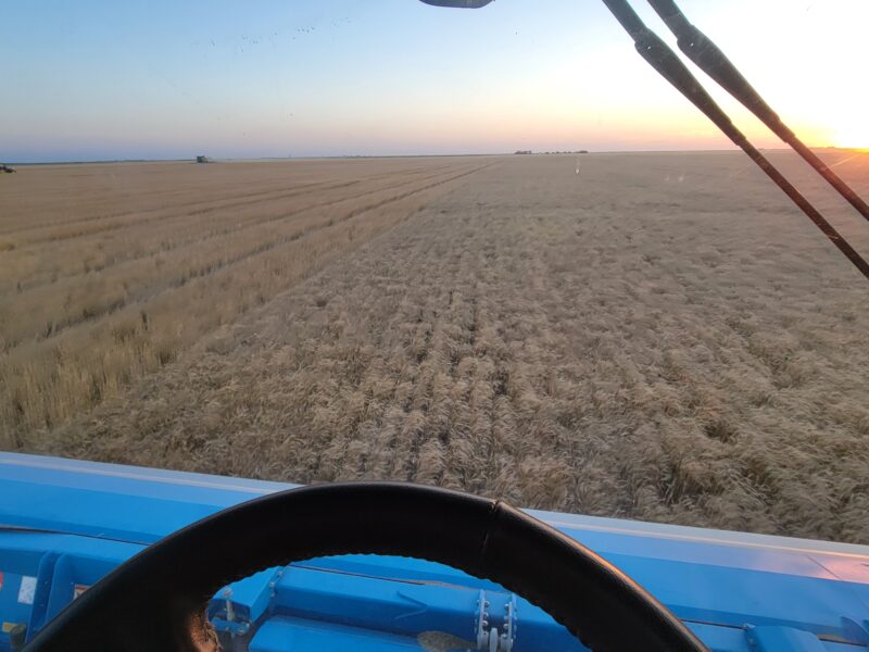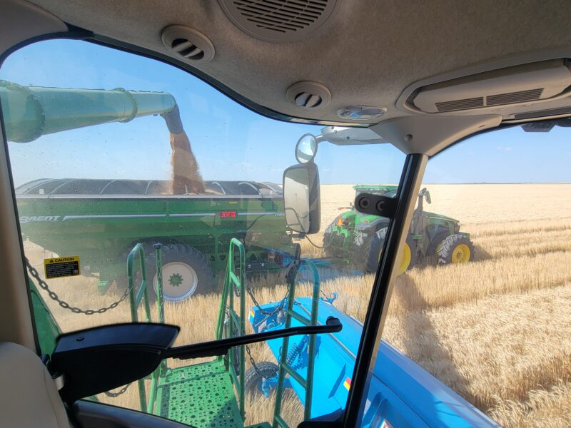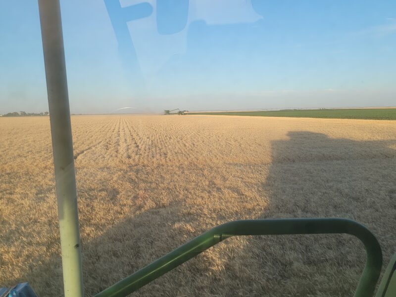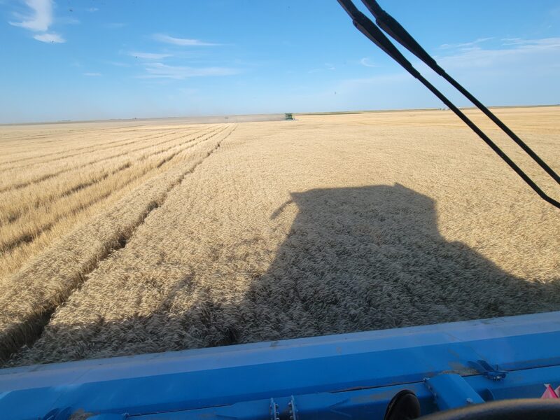 The days have been hot, and the wind has been blowing. Our forecast continues to be hot in the 90s and 100s and windy. However, there are slight chances of thunderstorms. I’m enjoying all of my combine time. The fields are flat, smooth and mostly square quarters and half sections. We are using our Shelbourne Reynolds stripper headers, and the fields are dry and conditions good.