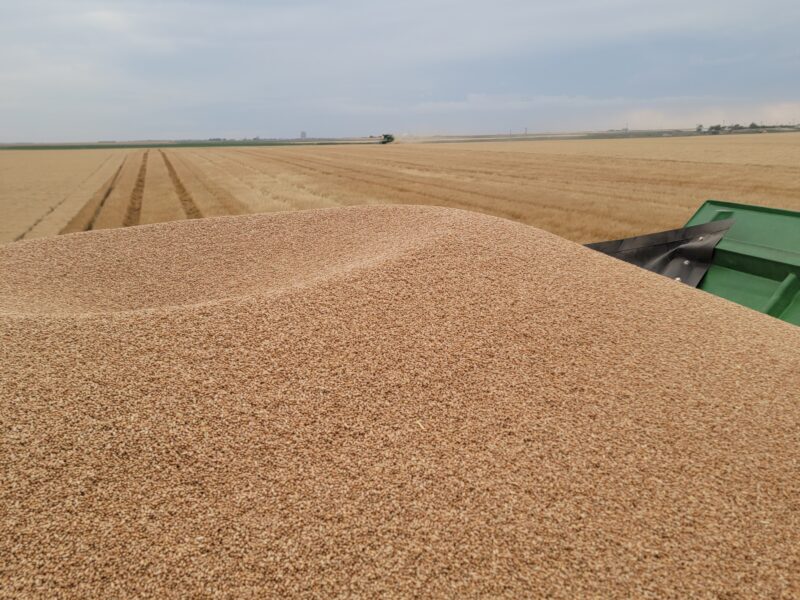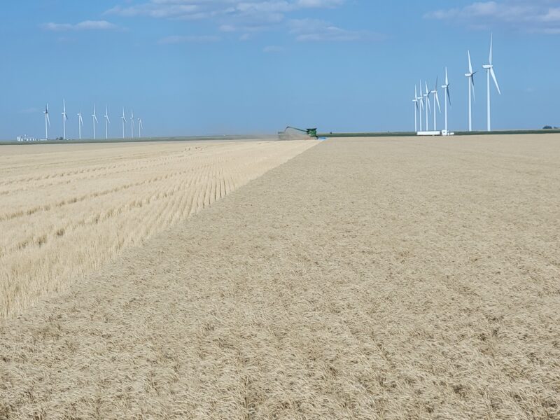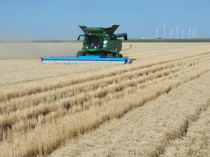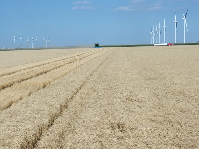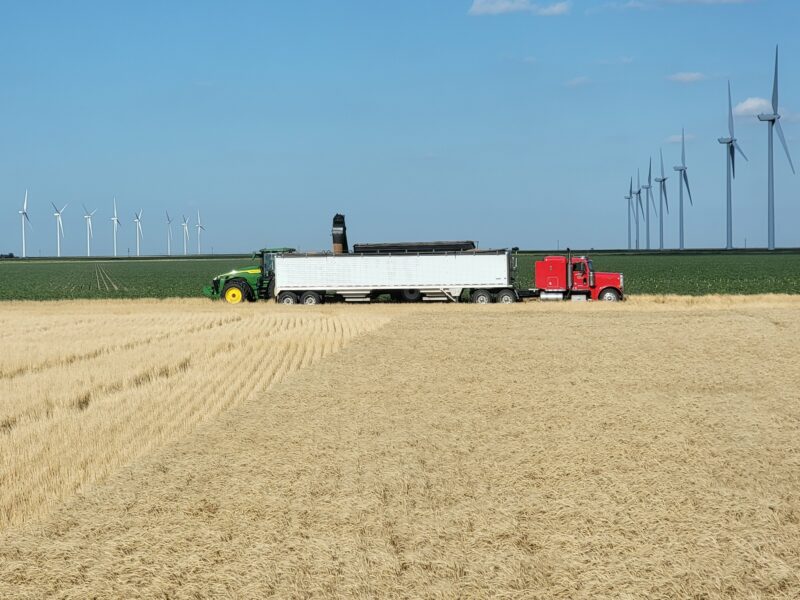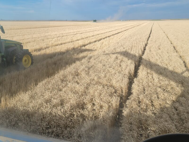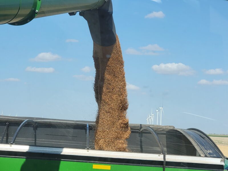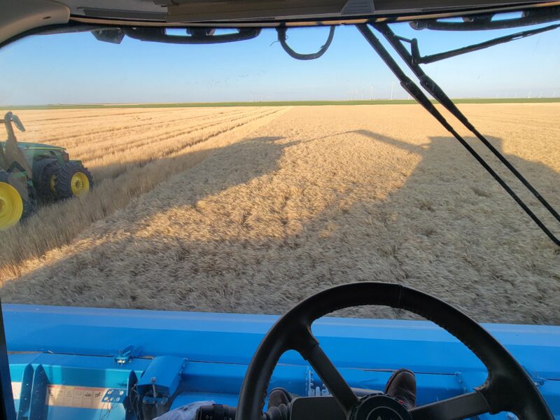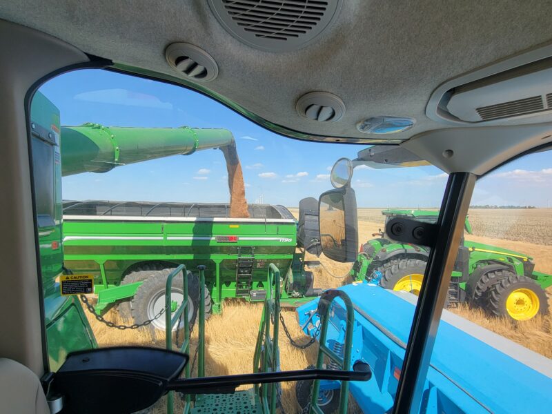 Western Kansas — When we arrived out west on June 20, I didn’t know what to expect for wheat yields. To my surprise, the dryland wheat is yielding very well. The first quarter of wheat I cut made 95 bushels per acre. It was one of the most beautiful fields of wheat I’ve ever cut. All of the dryland wheat has been yielding well, and I’ve been calling it wowzer wheat. Like wow! It’s nice wheat.