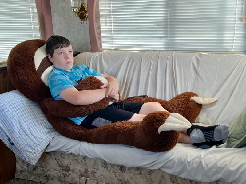 Ezra finds a a comfy spot with (or on) Gerald the stuffed sloth to watch some Olympic basketball.