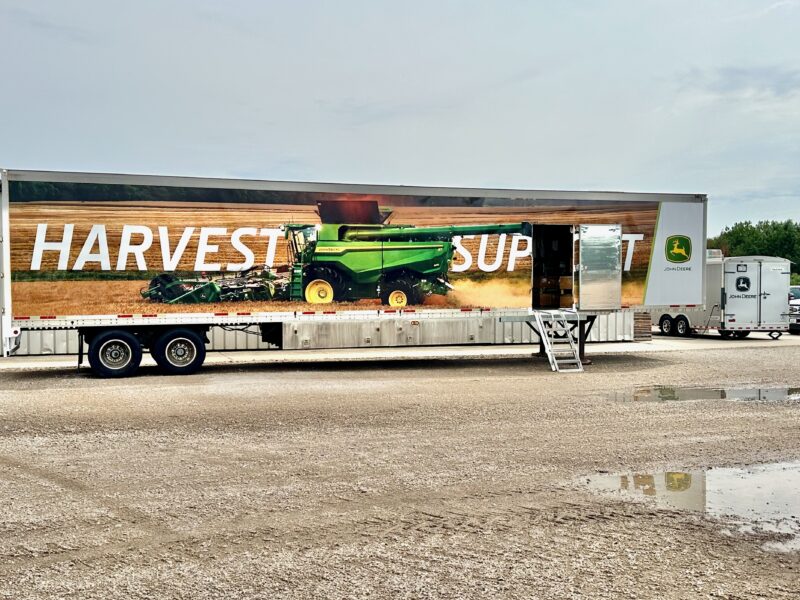John Deere helps with repairs by dispatching a factory support team, including techs & trailers of parts.