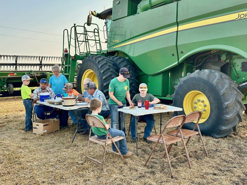 The crew takes a few minutes to eat dinner together in the field before moving to the next field.