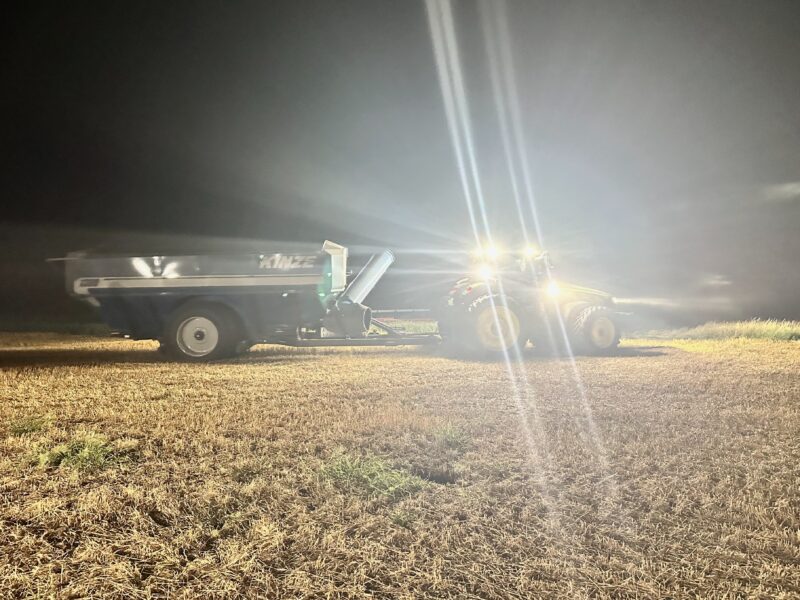 High yields means Titus keeps busy in the grain cart. Nighttime results in an impressive light show.