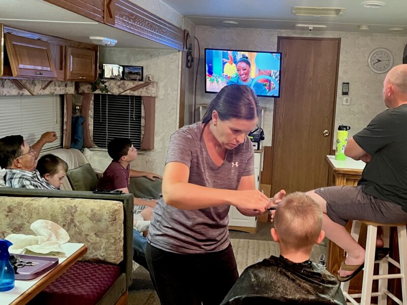 Brenda gives hair cuts while the crew cheers on Team USA at the Paris Olympic Games.