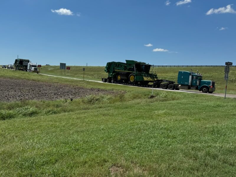 Once the two cotton pickers were loaded and chained down, we called it a day and decided we would head out first thing the next morning. The next morning, we were all bright-eyed and bushy-tailed, ready to hit the road. We headed north to the southeastern area of Texas. The cotton is not quite ready to be harvested, but we wanted to get our machines there. We have a couple of more weeks before we get to picking. This was the second time I had to be lead escort for two of those massive pieces of equipment. Thankfully, the trip was smooth and flawless! Those kinds of hauls make me want to do it again.