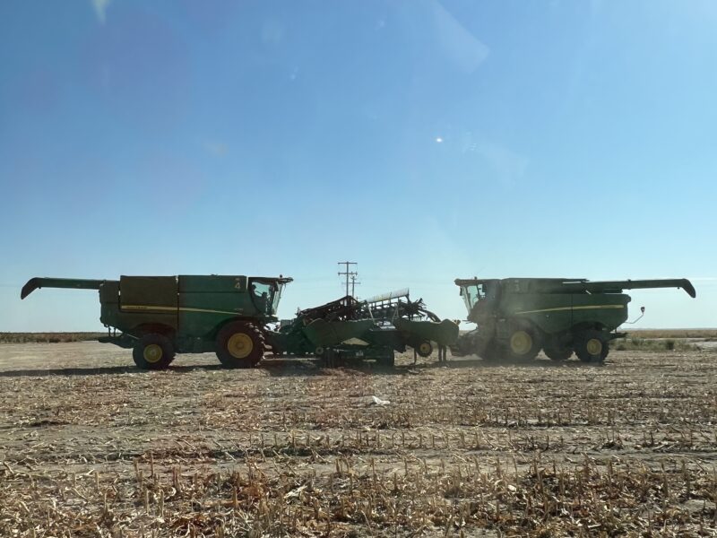 We have run into some green corn, so we made the decision with the farmer to swap concaves and jump on some milo. The milo we harvested was dry land milo. It did not take long to harvest. It took us longer to move between fields than to harvest the crop. The boys had to run back into Colorado to harvest a field. They made the trek with their 40-foot draper heads on. That was fun! They have gotten so good with moving around with the headers on, bobbing and weaving through all the signs on both sides of the roads.