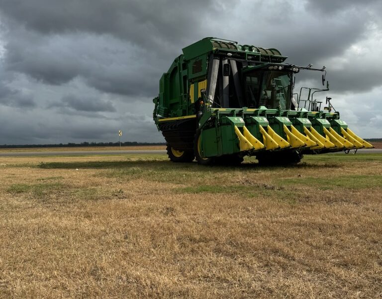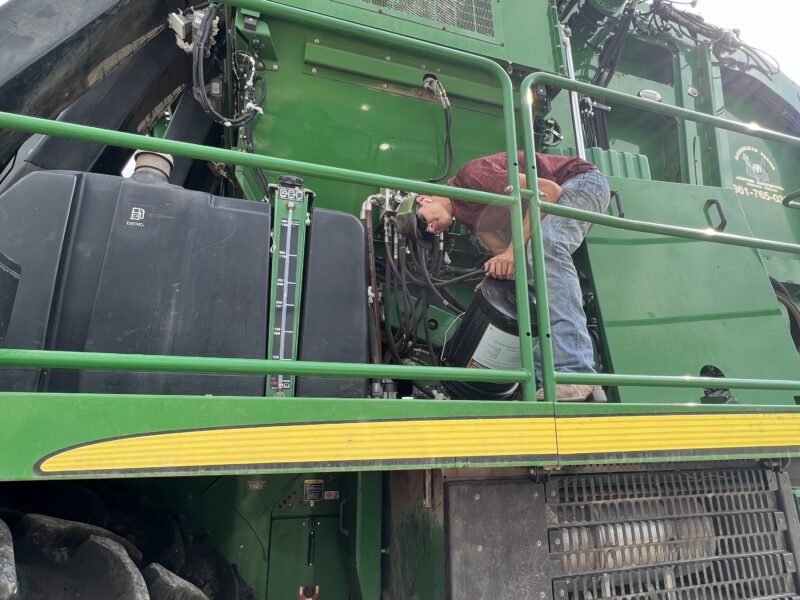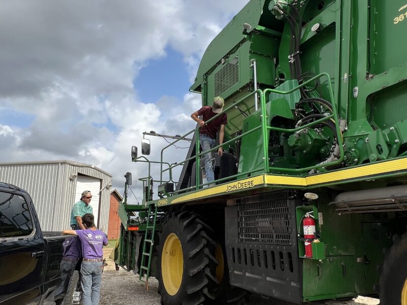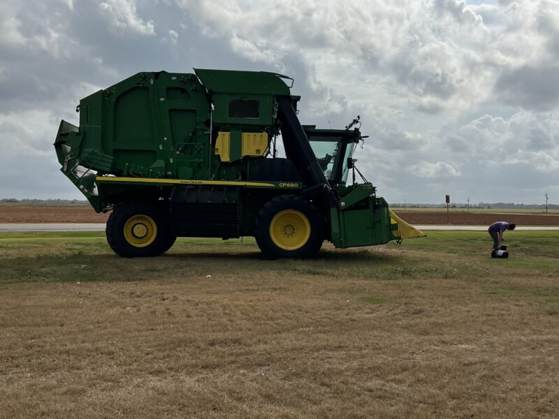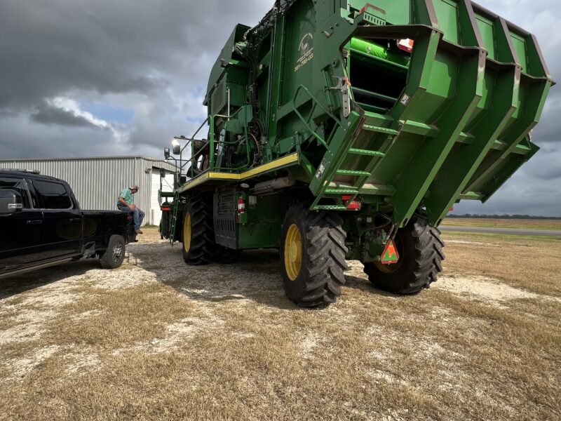After we serviced them, Wailynn and Wyatt drove them to the field. We only have two cotton pickers with us for this harvest stop. They made it to the field, and it started to rain. It wasn’t too heavy, but it was rain shower after rain shower. They were not able to start picking.