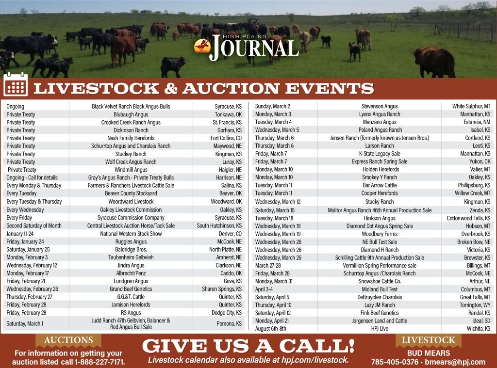 Livestock Auction Calendar, Livestock Calendar Livestock Calendar January 24 2025 By Heather Noll January 23, 2025 Listen Now 0:00 TAGS: Arkansas Weekly, Cattle Report, clovis livestock, colorado weekly, ericson livestock market, Farmers & Ranchers Livestock Commission Salina, Hub City Livestock Auction, iowa weekly, joplin regional stockyards, lexington livestock market, livestock, livestock market, Montana Weekly, ogallala livestock auction, OKC West Livestock Market, Oklahoma National Stockyards, ozarks regional stockyards, pratt livestock, Producers Livestock Auction, Roswell Livestock Market, Springfield Livestock Market, Tri-State Livestock Auction, tulsa stockyards, Winter Livestock, woodward livestock, Wyoming Weekly Related Articles Livestock Auction Calendar February 16 2024 Livestock Auction Calendar March 1 2024 Livestock Auction Calendar March 8 2024 Livestock Calendar March 15 2024