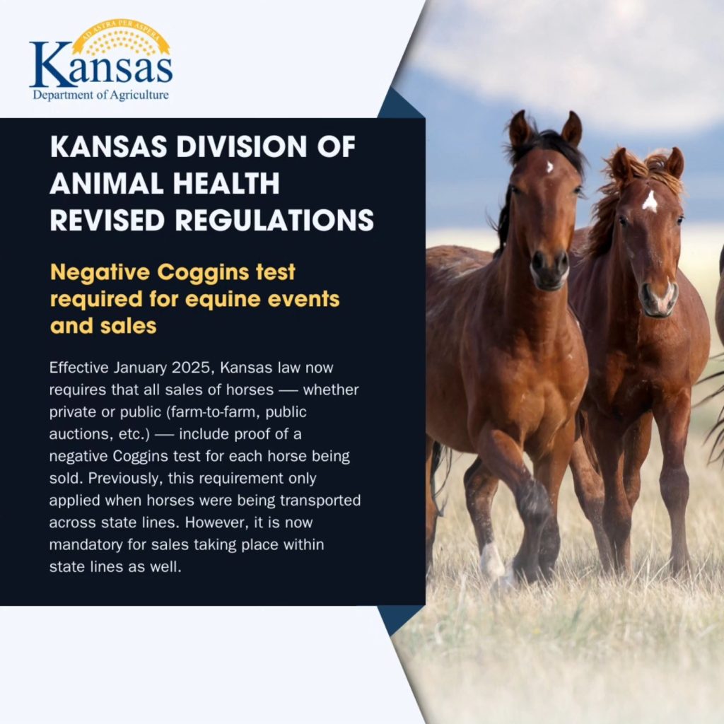 According to the Kansas Department of Agriculture’s Animal Health Spring 2025 newsletter, there have been updates to several regulations for horses and livestock.