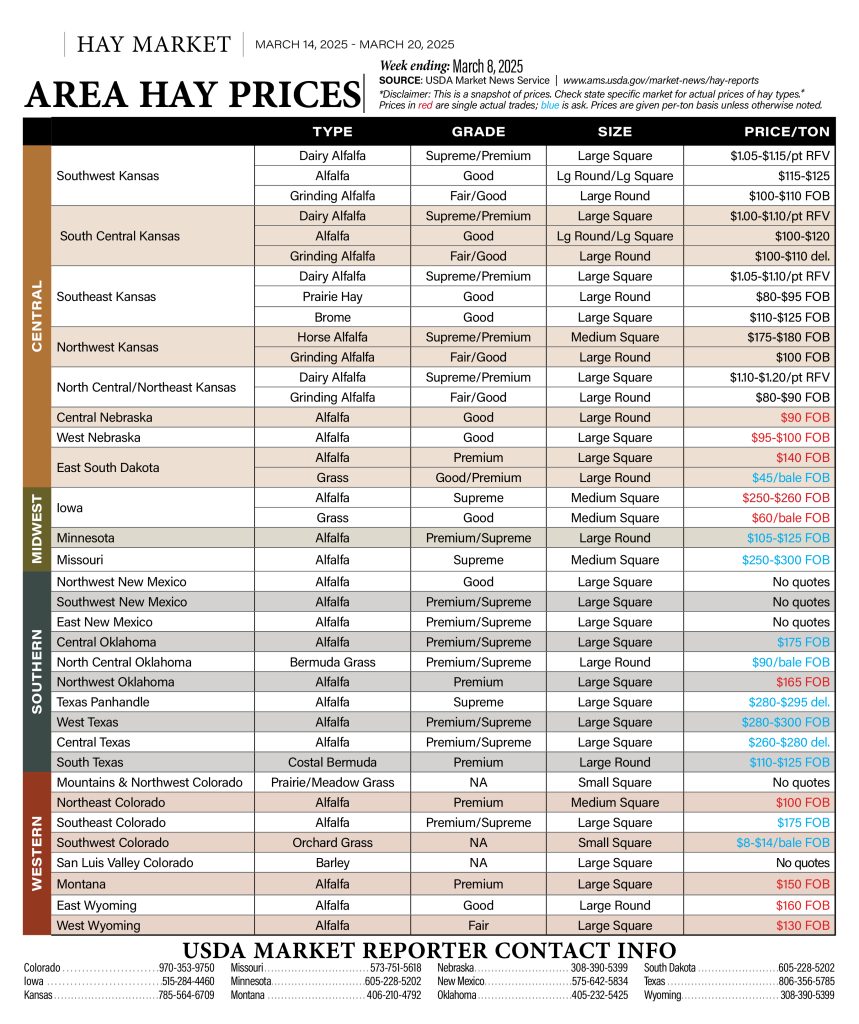 Area Hay Prices, Forage Crops, Hay Market News, Hay Range Pasture, Hay Report, Markets Area Hay Prices March 8, 2025 By HPJ Staff March 11, 2025 Listen Now 0:00 TAGS: 3 Tie Small Square, alfalfa, area hay prices, bermuda grass, bluestem, Central Nebraska Hay, Central New Mexico Hay, Central Oklahoma Hay, Central Texas Hay, colorado hay, costal bermuda, East Wyoming Hay, fair hay, good hay, grass, grinding alfalfa, Hay delivered, hay market, Iowa Hay, kansas hay, large round bale, large square bale, meadow grass, Medium Bale, Minnesota Hay, missouri hay, Montains Northwest Colorado Hay, Montana hay, Mountains Colorado Hay, Nebraska hay, New Mexico Hay, North Central Kansas Hay, North Central Oklahoma Hay, Northeast Colorado Hay, Northwest Colorado Hay, Northwest Kansas Hay, Northwest New Mexico Hay, Northwest Oklahoma Hay, Oklahoma hay, Platte Valley Nebraska Hay, prairie grass, premium hay, San Luis Valley Colorado Hay, small square bale, South Central Kansas Hay, south dakota hay, South Hay, South Texas Hay, Southeast Colorado Hay, Southeast Kansas Hay, Southeast New Mexico Hay, Southwest Colorado Hay, Southwest Kansas Hay, Supreme hay, texas hay, Texas Panhandle Hay, timothy hay, West Texas Hay, West Wyoming Hay, wyoming hay Related Articles Area Hay Prices January 11, 2025 Area Hay Prices January 25, 2025 Area Hay Prices February 1, 2025 Area Hay Prices February 8, 2025