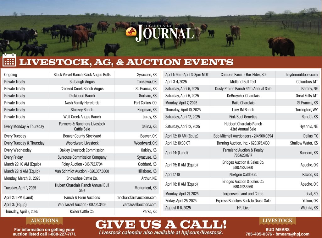 Livestock Auction Calendar, Livestock Calendar Livestock Calendar March 28 2025 By Heather Noll March 27, 2025 Listen Now 0:00 TAGS: Arkansas Weekly, Cattle Report, clovis livestock, colorado weekly, ericson livestock market, Farmers & Ranchers Livestock Commission Salina, Hub City Livestock Auction, iowa weekly, joplin regional stockyards, lexington livestock market, livestock, livestock market, Montana Weekly, ogallala livestock auction, OKC West Livestock Market, Oklahoma National Stockyards, ozarks regional stockyards, pratt livestock, Producers Livestock Auction, Roswell Livestock Market, Springfield Livestock Market, Tri-State Livestock Auction, tulsa stockyards, Winter Livestock, woodward livestock, Wyoming Weekly Related Articles Livestock Auction Calendar February 16 2024 Livestock Auction Calendar March 1 2024 Livestock Auction Calendar March 8 2024 Livestock Calendar March 15 2024