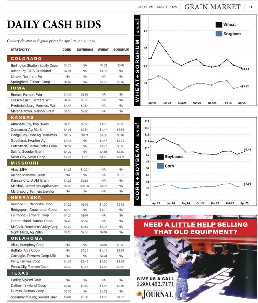 Alfalfa, Canola, Corn, Cotton, Crops, Dry Beans, Forage Crops, Grain Sorghum, Soybeans, Wheat Daily Cash Bids April 29 By Tracy Shinogle May 01, 2025 Listen Now 0:00 Daily Cash Bids April 29 TAGS: Related Articles Daily Cash Bids June 18th Daily Cash July 12th Daily Cash July 19 Daily Cash Bids July 30th