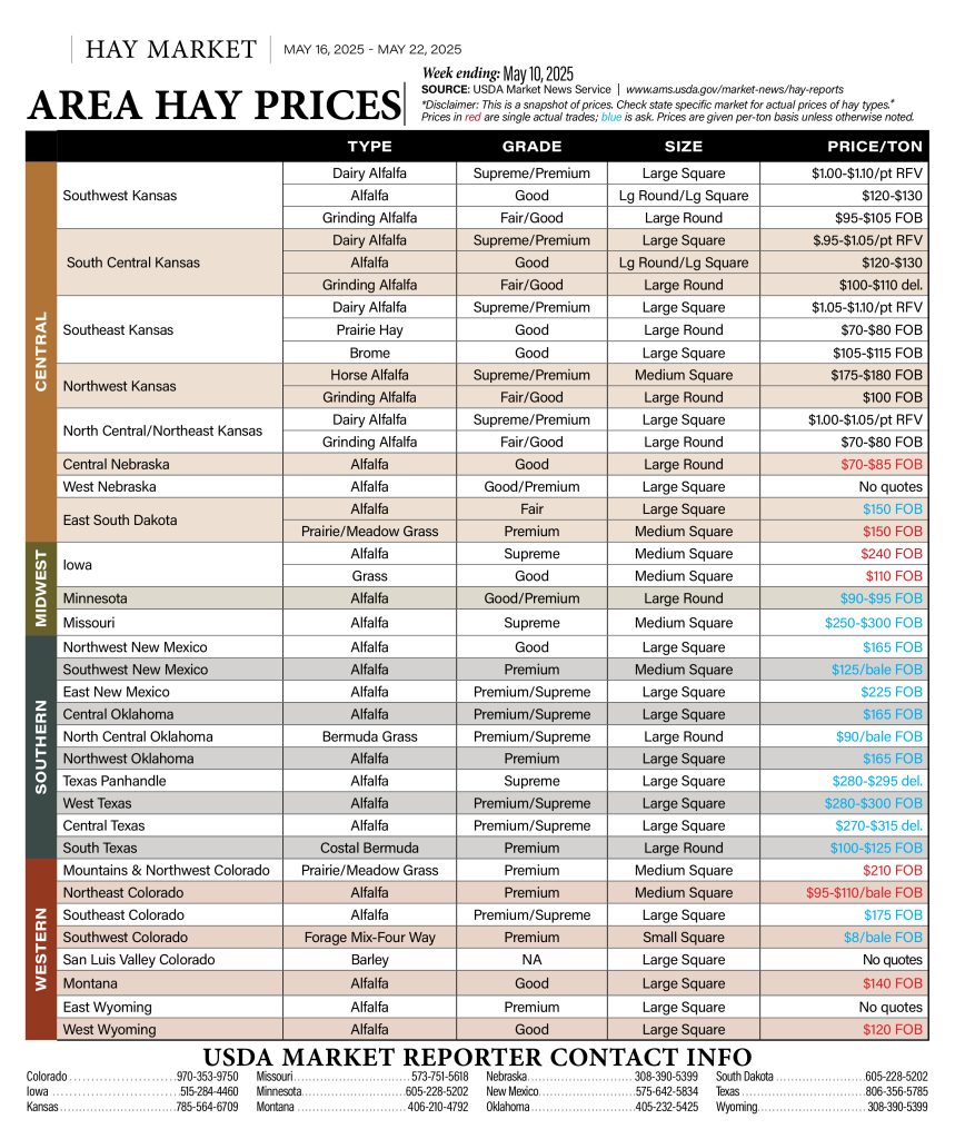 Area Hay Prices, Forage Crops, Hay Market News, Hay Range Pasture, Hay Report, Markets Area Hay Prices May 10, 2025 By Kylene Scott May 13, 2025 Listen Now 0:00 TAGS: 3 Tie Small Square, alfalfa, area hay prices, bermuda grass, bluestem, Central Nebraska Hay, Central New Mexico Hay, Central Oklahoma Hay, Central Texas Hay, colorado hay, costal bermuda, East Wyoming Hay, fair hay, good hay, grass, grinding alfalfa, Hay delivered, hay market, Iowa Hay, kansas hay, large round bale, large square bale, meadow grass, Medium Bale, Minnesota Hay, missouri hay, Montains Northwest Colorado Hay, Montana hay, Mountains Colorado Hay, Nebraska hay, New Mexico Hay, North Central Kansas Hay, North Central Oklahoma Hay, Northeast Colorado Hay, Northwest Colorado Hay, Northwest Kansas Hay, Northwest New Mexico Hay, Northwest Oklahoma Hay, Oklahoma hay, Platte Valley Nebraska Hay, prairie grass, premium hay, San Luis Valley Colorado Hay, small square bale, South Central Kansas Hay, south dakota hay, South Hay, South Texas Hay, Southeast Colorado Hay, Southeast Kansas Hay, Southeast New Mexico Hay, Southwest Colorado Hay, Southwest Kansas Hay, Supreme hay, texas hay, Texas Panhandle Hay, West Texas Hay, West Wyoming Hay, wyoming hay Related Articles Area Hay Prices January 11, 2025 Area Hay Prices January 25, 2025 Area Hay Prices February 1, 2025 Area Hay Prices February 8, 2025
