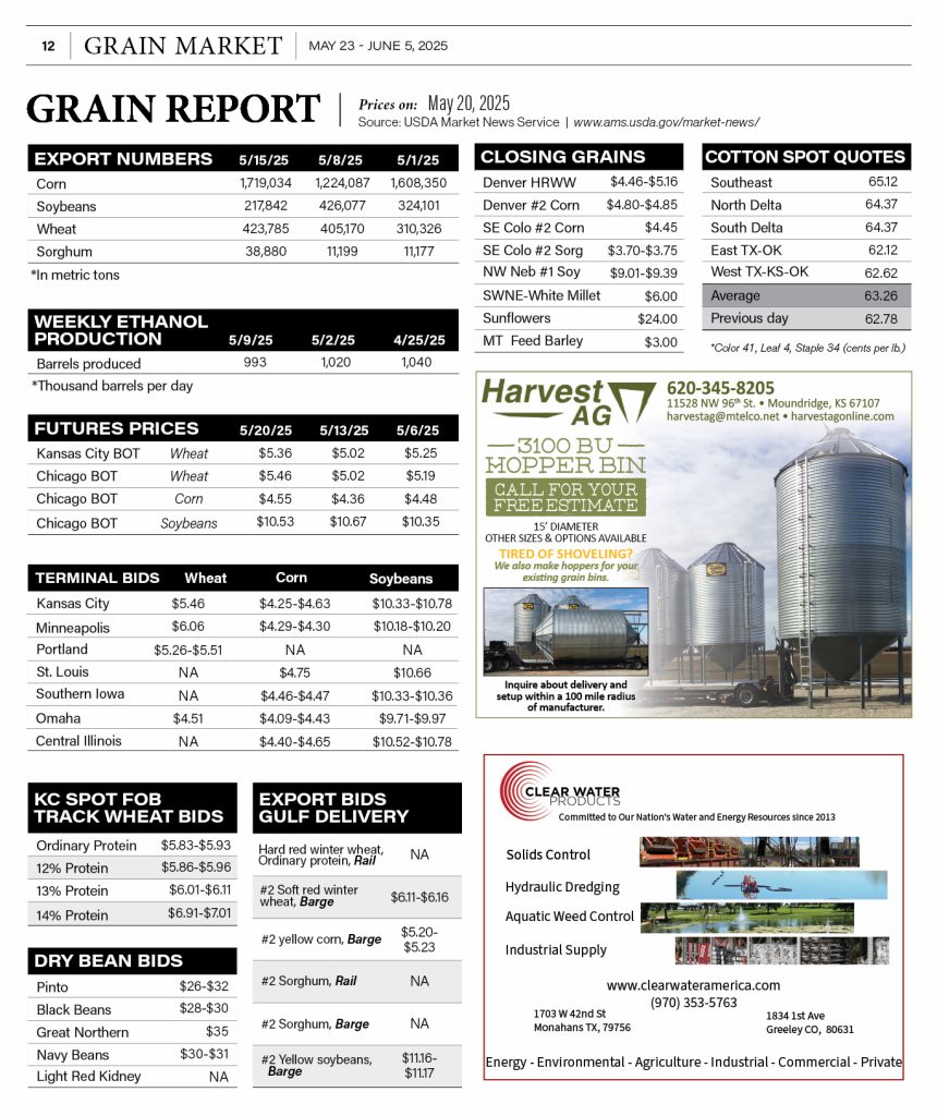 Corn, Dry Beans, Grain Markets, Grain Report, Grain Sorghum, Soybeans, Wheat Grain Report May 20 2025 By Heather Noll May 21, 2025 Listen Now 0:00 TAGS: corn, dry beans, grain market, grain markets, grain report, markets, sorghum, soybeans, wheat Related Articles Grain Report February 27 2024 Grain Report March 5 2024 Grain Report March 15 2024 Grain Report March 19 2024