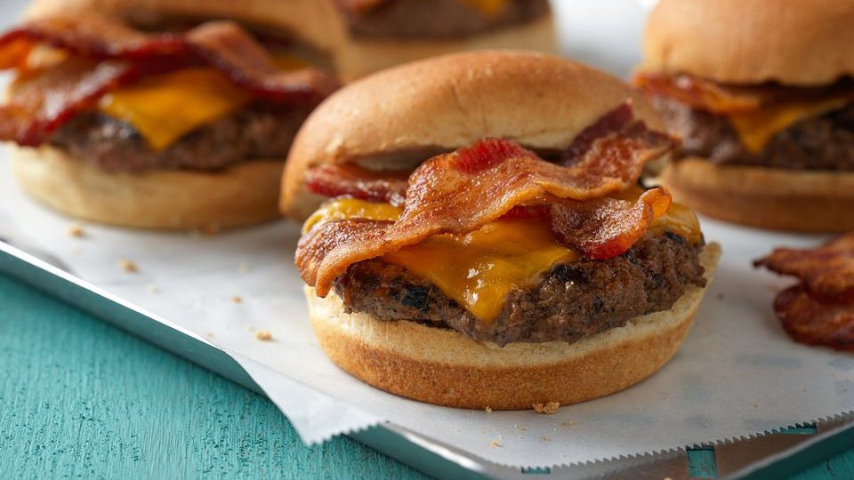 - Place burgers on bottom of buns; top with bacon slices. Close sandwiches.