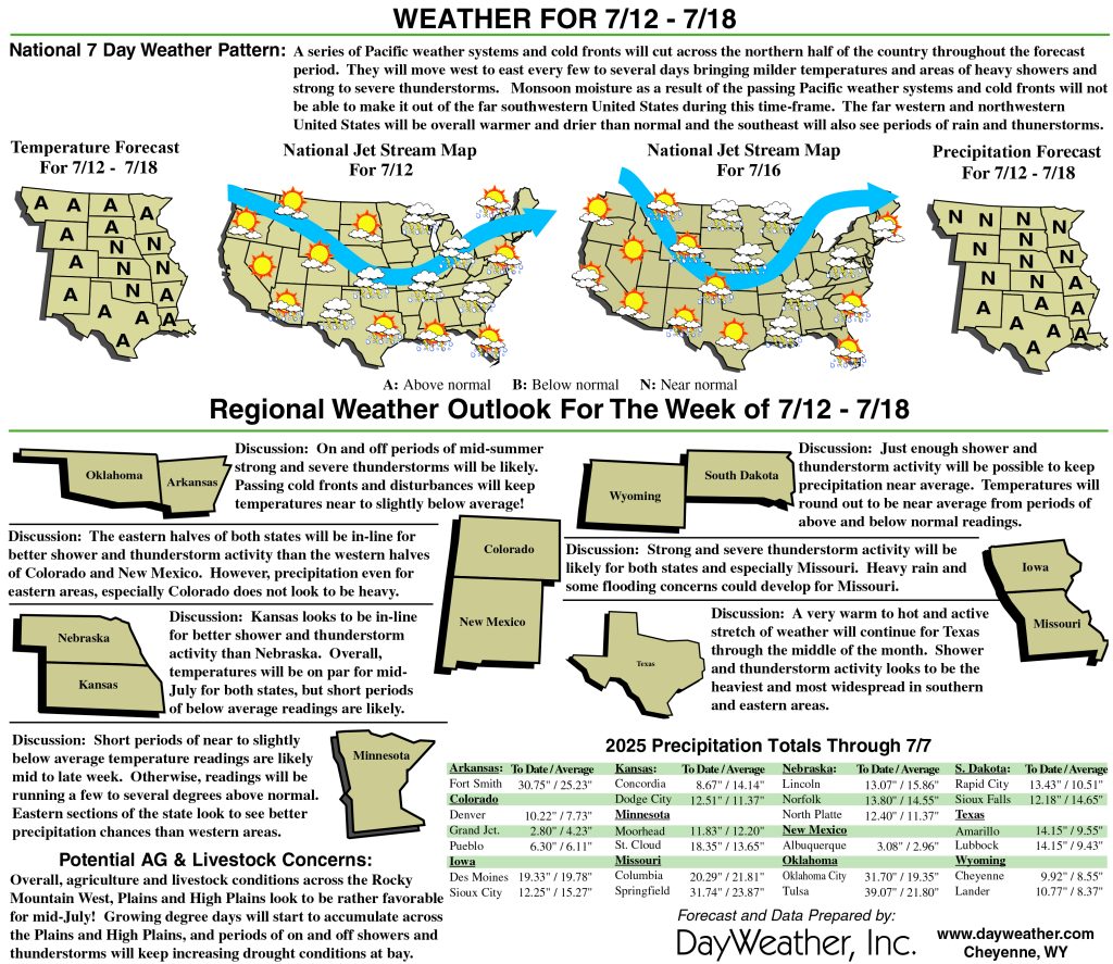 From July 10 to 14, a cold front is forecast to shift southeast across the central U.S. and provide the focus for thunderstorms. The most widespread, heavy precipitation (more than 1.5 inches) is forecast across the Upper Mississippi Valley and western Corn Belt, but locally heavy precipitation is expected as far south and west as the southern Great Plains and eastern New Mexico.