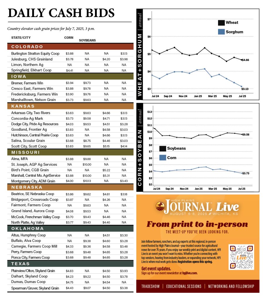 Corn, Crops, Grain Sorghum, Soybeans, Wheat Cash Bids: July 11, 2025 By HPJ Staff July 11, 2025 Listen Now 0:00 PHOTO: Combine harvester harvests wheat. (Adobe Stock │ #602027180 – scharfsinn86) TAGS: alfalfa, corn, crops, Daily Cash Bids, sorghum, soybeans, wheat Related Articles Daily Cash Bids June 18th Daily Cash July 12th Daily Cash Bids July 23 Daily Cash Bids Aug. 6 2024