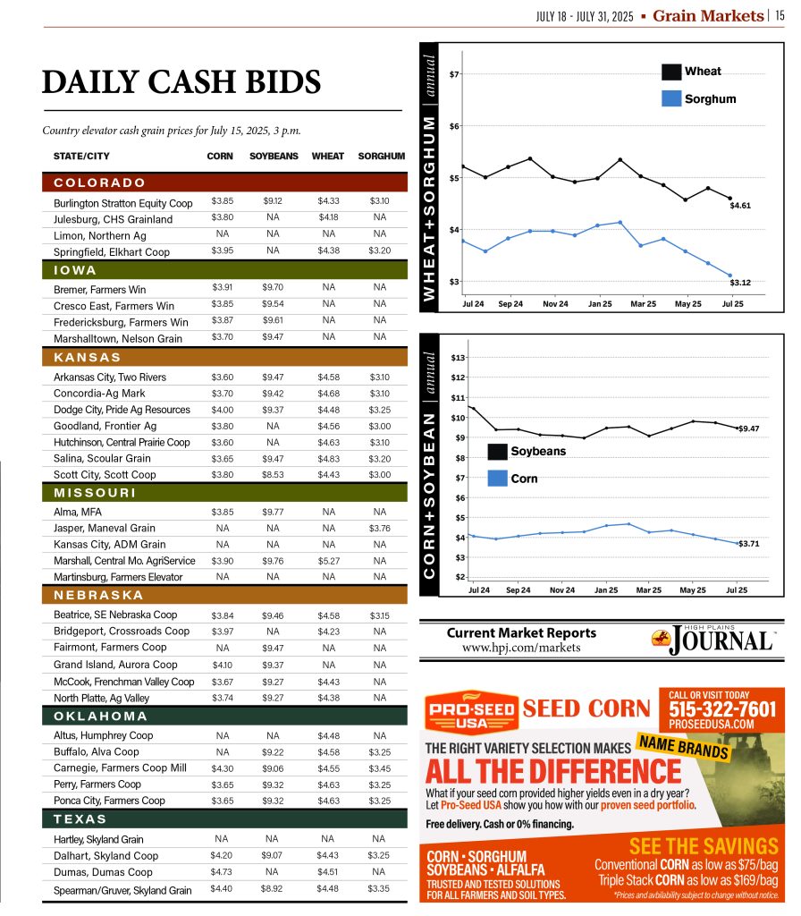 Corn, Crops, Forage Crops, Grain Sorghum, Soybeans, Wheat Cash Bids July 15 By Tracy Shinogle July 17, 2025 Listen Now 0:00 Cash Bids July 15 TAGS: colorado, corn, iowa, kansas, missouri, nebraska, oklahoma, sorghum, soybeans, texas, wheat Related Articles Daily Cash Bids: Dec. 3, 2024 Cash Bids June 23 Putting a value on weed's theft from yields Early fall moisture welcome news