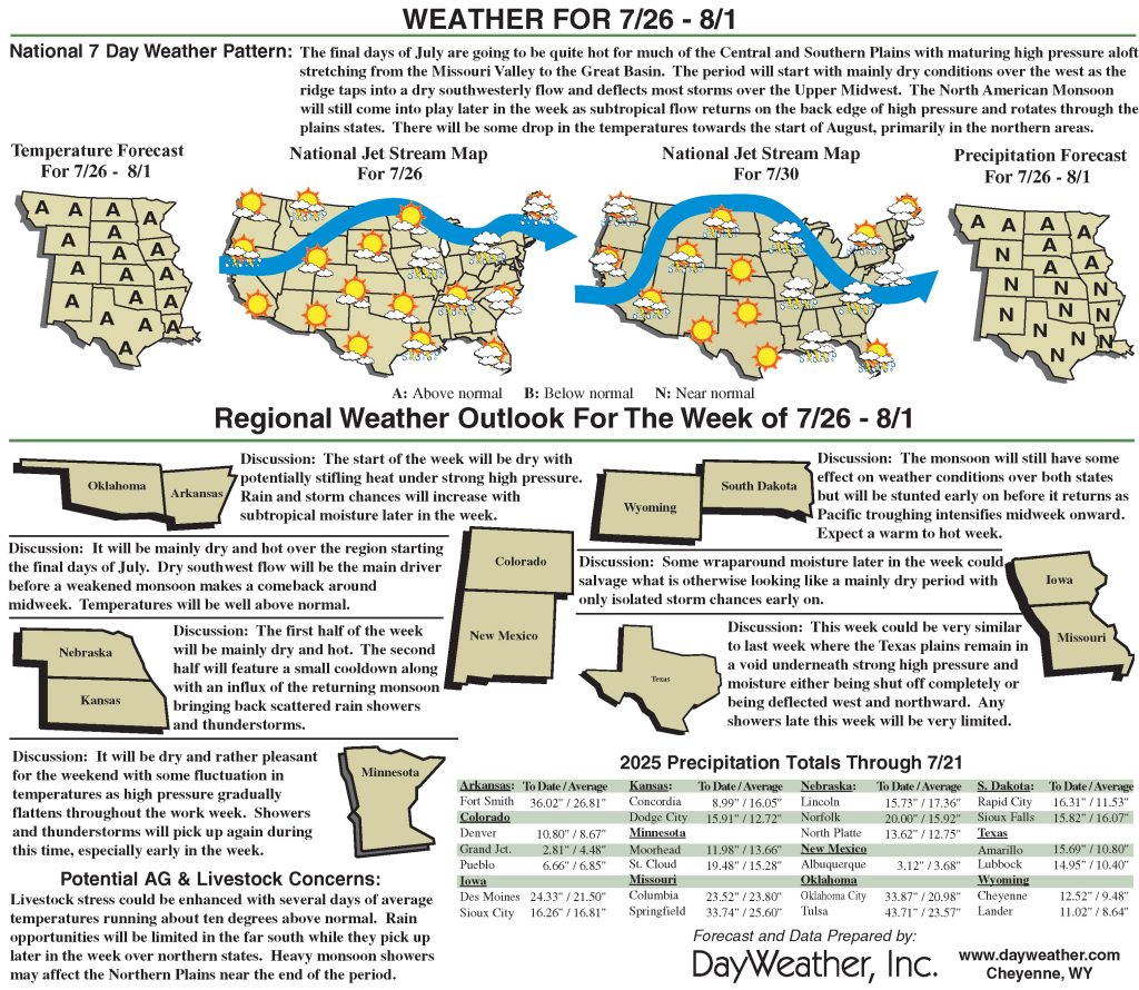 The Climate Prediction Center’s 6-10-day outlooks call for a moderate-to-high probability of above-normal temperatures across most of the conterminous U.S. In terms of precipitation, there is a low-to-moderate probability of above-normal precipitation across the Pacific Northwest, northern portions of the Intermountain West, central and northern Plains, Gulf Coast region, and much of the Eastern Seaboard.