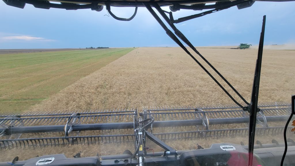 We have five combines here cutting wheat and four on the road moving north. The yields have been decent. The fields are soft due to the recent rainfall. There have been several mud holes. There are also fields that have been taken over by sawfly damage and mosaic disease. It’s a terrible sight. I’d like to find more work here but there’s not much wheat in the area anymore. It used to be wheat country now it’s full of fall crops.