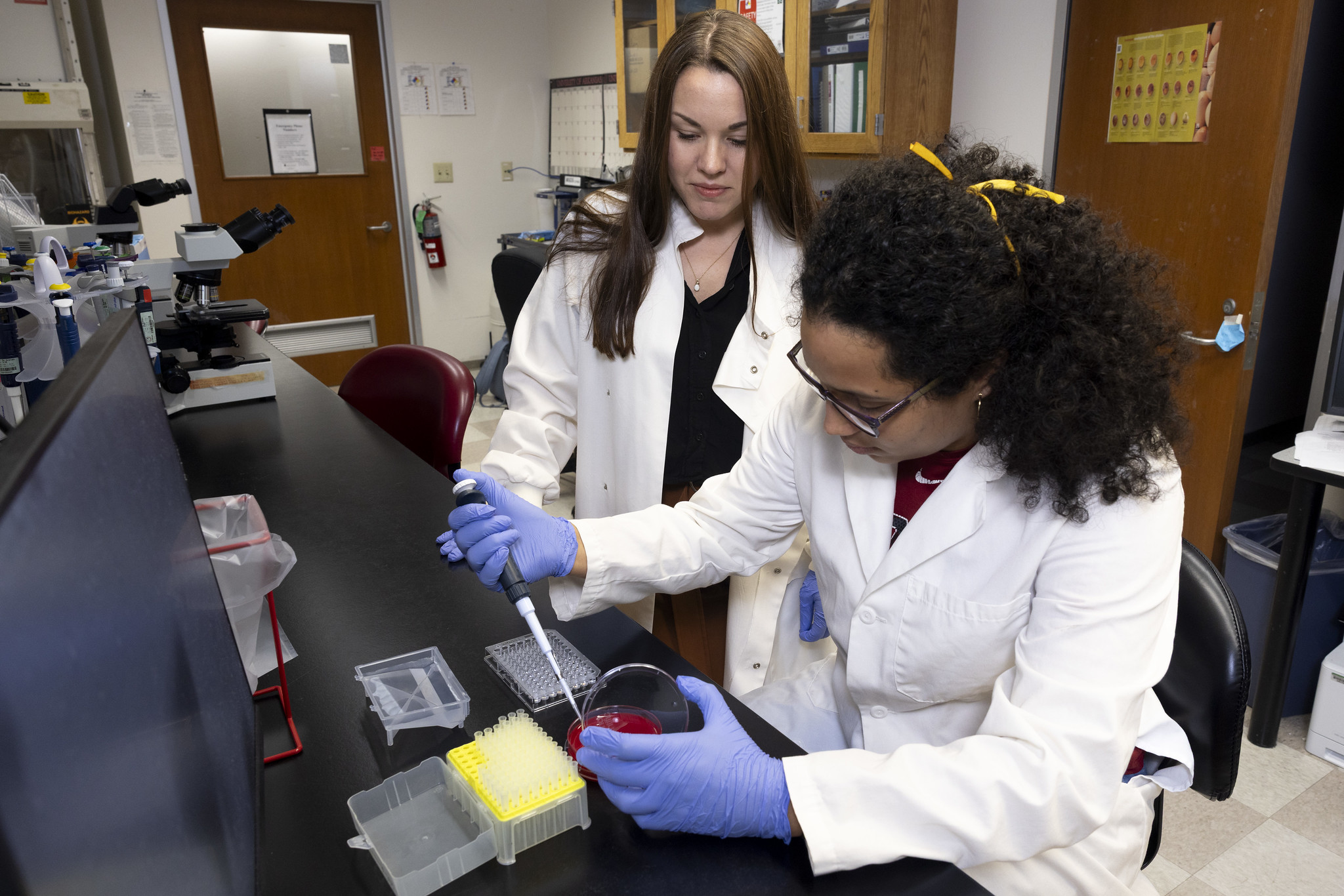 TOP PHOTO: Danielle Graham, left, works alongside her advisee Karen Echevarria, a lab assistant and undergraduate student at the University of Arkansas majoring in animal science. (U of A System Division of Agriculture photo)