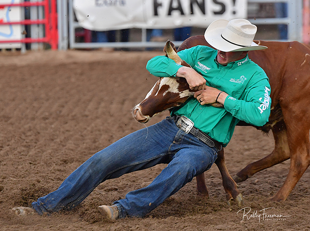 “It’s a different level of bulldogging out here,” he said. “There are great circuit guys in the Mountain States, but out here, they’re full-grown men. They take advantage of every good steer they draw, so when you draw a good one, you have to bulldog correctly and make great runs. Your horse has to be on point every time. You’ve got to have a good hazer on the other side that helps you.