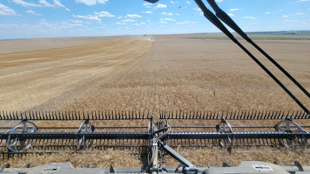 North Dakota – We made it up north and it feels great to be back to my favorite place to cut wheat. I love the pretty scenery; big fields and I love the view and being able to see so far from the hilltops. When we got here earlier this week we unloaded and went straight to the field. The spring wheat is yielding good, and the weather has been fit for getting wheat cut.