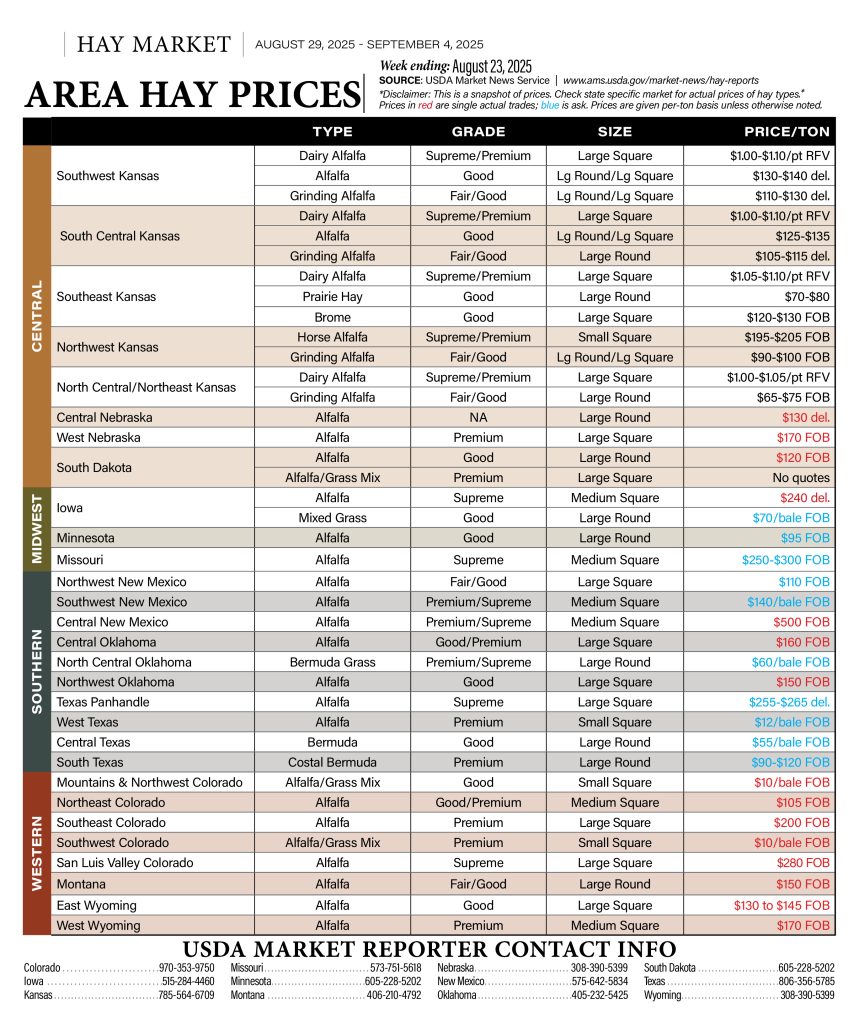 Area Hay Prices, Forage Crops, Hay Market News, Hay Range Pasture, Hay Report, Markets Area Hay Prices August 23, 2025 By HPJ Staff August 26, 2025 Listen Now 0:00 TAGS: 3 Tie Small Square, alfalfa, area hay prices, bermuda grass, bluestem, Central Nebraska Hay, Central New Mexico Hay, Central Oklahoma Hay, Central Texas Hay, colorado hay, costal bermuda, East Wyoming Hay, fair hay, good hay, grass, grinding alfalfa, Hay delivered, hay market, Iowa Hay, kansas hay, large round bale, large square bale, meadow grass, Medium Bale, Minnesota Hay, missouri hay, Montains Northwest Colorado Hay, Montana hay, Mountains Colorado Hay, Nebraska hay, New Mexico Hay, North Central Kansas Hay, North Central Oklahoma Hay, Northeast Colorado Hay, Northwest Colorado Hay, Northwest Kansas Hay, Northwest New Mexico Hay, Northwest Oklahoma Hay, Oklahoma hay, Platte Valley Nebraska Hay, prairie grass, premium hay, San Luis Valley Colorado Hay, small square bale, South Central Kansas Hay, south dakota hay, South Hay, South Texas Hay, Southeast Colorado Hay, Southeast Kansas Hay, Southeast New Mexico Hay, Southwest Colorado Hay, Southwest Kansas Hay, Supreme hay, texas hay, Texas Panhandle Hay, timothy hay, West Texas Hay, West Wyoming Hay, wyoming hay Related Articles Area Hay Prices January 11, 2025 Area Hay Prices January 25, 2025 Area Hay Prices February 1, 2025 Area Hay Prices February 8, 2025