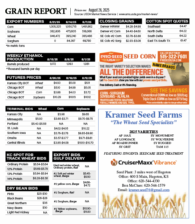 Corn, Dry Beans, Grain Markets, Grain Report, Grain Sorghum, Soybeans, Wheat Grain Report August 26 2025 By Heather Noll August 28, 2025 Listen Now 0:00 TAGS: corn, dry beans, grain market, grain markets, grain report, markets, sorghum, soybeans, wheat Related Articles Grain Report February 27 2024 Grain Report March 5 2024 Grain Report March 15 2024 Grain Report March 19 2024