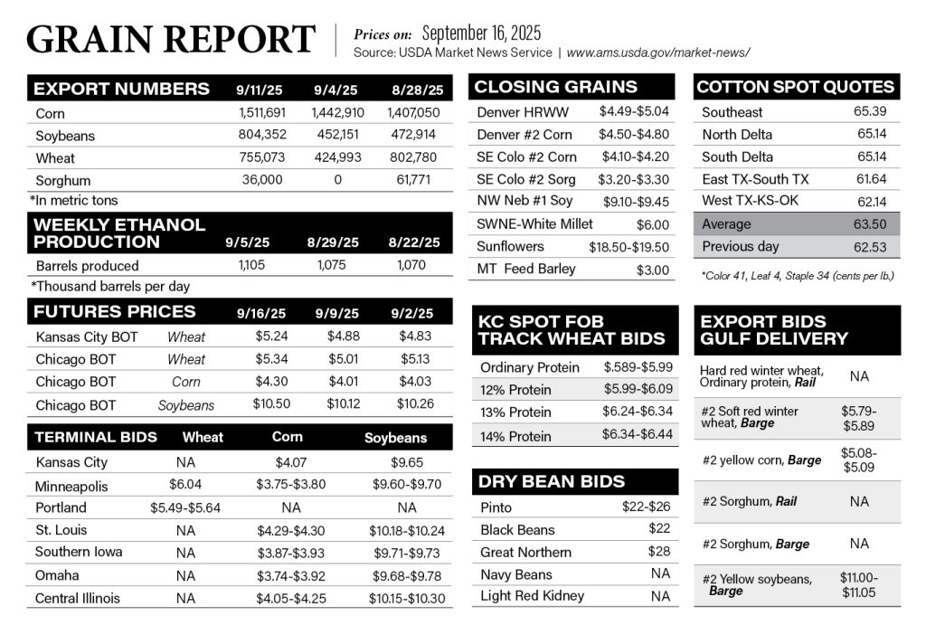 Corn, Dry Beans, Grain Markets, Grain Report, Grain Sorghum, Soybeans, Wheat Grain Report September 16 2025 By Heather Noll September 18, 2025 Listen Now 0:00 TAGS: corn, dry beans, grain market, grain markets, grain report, markets, sorghum, soybeans, wheat Related Articles Grain Report February 27 2024 Grain Report March 5 2024 Grain Report March 15 2024 Grain Report March 19 2024