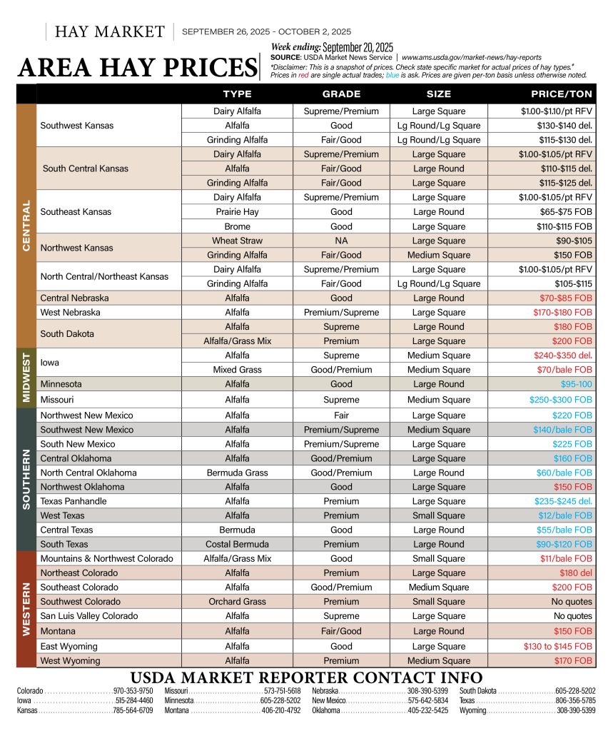 Area Hay Prices, Forage Crops, Hay Market News, Hay Range Pasture, Hay Report, Markets Area Hay Prices September 20, 2025 By HPJ Staff September 23, 2025 Listen Now 0:00 TAGS: 3 Tie Small Square, alfalfa, area hay prices, bermuda grass, bluestem, Central Nebraska Hay, Central New Mexico Hay, Central Oklahoma Hay, Central Texas Hay, colorado hay, costal bermuda, East Wyoming Hay, fair hay, good hay, grass, grinding alfalfa, Hay delivered, hay market, Iowa Hay, kansas hay, large round bale, large square bale, meadow grass, Medium Bale, Minnesota Hay, missouri hay, Montains Northwest Colorado Hay, Montana hay, Mountains Colorado Hay, Nebraska hay, New Mexico Hay, North Central Kansas Hay, North Central Oklahoma Hay, Northeast Colorado Hay, Northwest Colorado Hay, Northwest Kansas Hay, Northwest New Mexico Hay, Northwest Oklahoma Hay, Oklahoma hay, Platte Valley Nebraska Hay, prairie grass, premium hay, San Luis Valley Colorado Hay, small square bale, South Central Kansas Hay, south dakota hay, South Hay, South Texas Hay, Southeast Colorado Hay, Southeast Kansas Hay, Southeast New Mexico Hay, Southwest Colorado Hay, Southwest Kansas Hay, Supreme hay, texas hay, Texas Panhandle Hay, timothy hay, West Texas Hay, West Wyoming Hay, wyoming hay Related Articles Area Hay Prices January 11, 2025 Area Hay Prices January 25, 2025 Area Hay Prices February 1, 2025 Area Hay Prices February 8, 2025