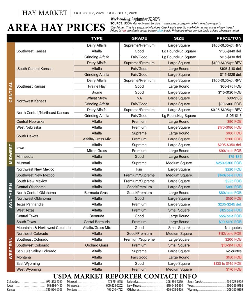 Area Hay Prices, Forage Crops, Hay Market News, Hay Range Pasture, Hay Report, Markets Area Hay Prices September 27, 2025 By HPJ Staff September 30, 2025 Listen Now 0:00 TAGS: 3 Tie Small Square, alfalfa, area hay prices, bermuda grass, bluestem, Central Nebraska Hay, Central New Mexico Hay, Central Oklahoma Hay, Central Texas Hay, colorado hay, costal bermuda, East Wyoming Hay, fair hay, good hay, grass, grinding alfalfa, Hay delivered, hay market, Iowa Hay, kansas hay, large round bale, large square bale, meadow grass, Medium Bale, Minnesota Hay, missouri hay, Montains Northwest Colorado Hay, Montana hay, Mountains Colorado Hay, Nebraska hay, New Mexico Hay, North Central Kansas Hay, North Central Oklahoma Hay, Northeast Colorado Hay, Northwest Colorado Hay, Northwest Kansas Hay, Northwest New Mexico Hay, Northwest Oklahoma Hay, Oklahoma hay, Platte Valley Nebraska Hay, prairie grass, premium hay, San Luis Valley Colorado Hay, small square bale, South Central Kansas Hay, south dakota hay, South Hay, South Texas Hay, Southeast Colorado Hay, Southeast Kansas Hay, Southeast New Mexico Hay, Southwest Colorado Hay, Southwest Kansas Hay, Supreme hay, texas hay, Texas Panhandle Hay, timothy hay, West Texas Hay, West Wyoming Hay, wyoming hay Related Articles Area Hay Prices January 11, 2025 Area Hay Prices January 25, 2025 Area Hay Prices February 1, 2025 Area Hay Prices February 8, 2025