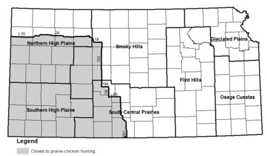 Prairie Chicken: Prairie Chicken hunting opportunities in the region should remain fair. Production was likely improved as precipitation offered better conditions, although precipitation was not as good as other regions. This region has maintained relatively stable densities paired with the greatest access in the state to appropriate habitat. Greater prairie-chickens occur throughout the Smoky Hills where large areas of native rangeland are intermixed with cropland. The best hunting will be found in the central portion of the region, but several other areas support huntable densities of birds in appropriate habitat. The southwestern portion of the region is within the closed zone (see map for unit boundaries).