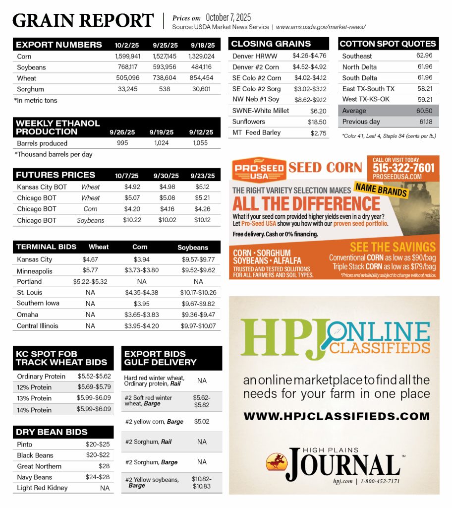 Corn, Dry Beans, Grain Markets, Grain Report, Grain Sorghum, Soybeans, Wheat Grain Report October 7 2025 By Heather Noll October 09, 2025 TAGS: corn, dry beans, grain market, grain markets, grain report, markets, sorghum, soybeans, wheat Related Articles Grain Report February 27 2024 Grain Report March 5 2024 Grain Report March 15 2024 Grain Report March 19 2024