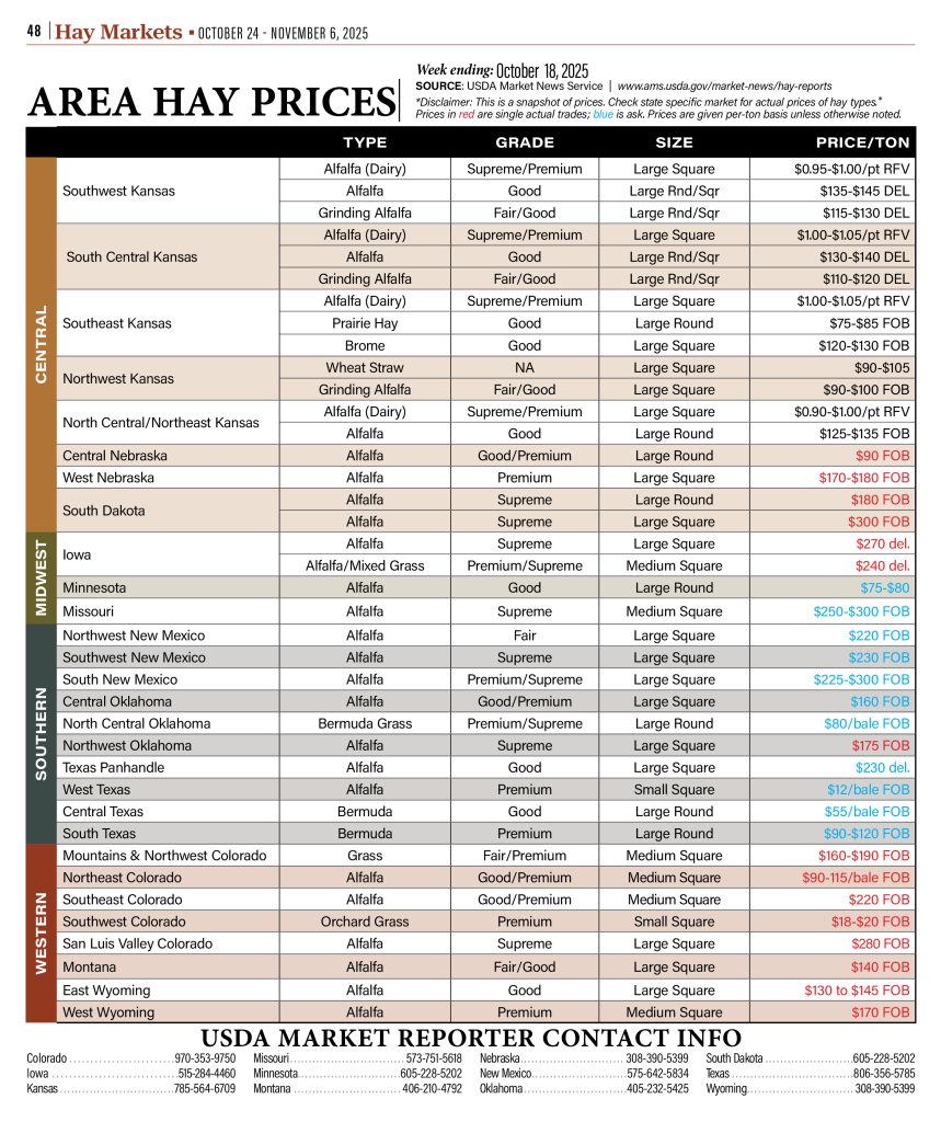 Area Hay Prices, Forage Crops, Hay Market News, Hay Range Pasture, Hay Report, Markets Area Hay Prices October 18, 2025 By HPJ Staff October 22, 2025 Listen Now 0:00 TAGS: 3 Tie Small Square, alfalfa, area hay prices, bermuda grass, bluestem, Central Nebraska Hay, Central New Mexico Hay, Central Oklahoma Hay, Central Texas Hay, colorado hay, costal bermuda, East Wyoming Hay, fair hay, good hay, grass, grinding alfalfa, Hay delivered, hay market, Iowa Hay, kansas hay, large round bale, large square bale, meadow grass, Medium Bale, Minnesota Hay, missouri hay, Montains Northwest Colorado Hay, Montana hay, Mountains Colorado Hay, Nebraska hay, New Mexico Hay, North Central Kansas Hay, North Central Oklahoma Hay, Northeast Colorado Hay, Northwest Colorado Hay, Northwest Kansas Hay, Northwest New Mexico Hay, Northwest Oklahoma Hay, Oklahoma hay, Platte Valley Nebraska Hay, prairie grass, premium hay, San Luis Valley Colorado Hay, small square bale, South Central Kansas Hay, south dakota hay, South Hay, South Texas Hay, Southeast Colorado Hay, Southeast Kansas Hay, Southeast New Mexico Hay, Southwest Colorado Hay, Southwest Kansas Hay, Supreme hay, texas hay, Texas Panhandle Hay, timothy hay, West Texas Hay, West Wyoming Hay, wyoming hay Related Articles Area Hay Prices January 11, 2025 Area Hay Prices January 25, 2025 Area Hay Prices February 1, 2025 Area Hay Prices February 8, 2025