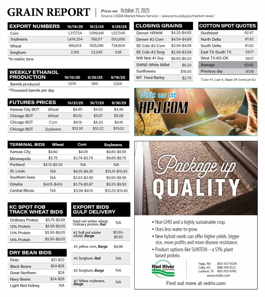 Corn, Dry Beans, Grain Markets, Grain Report, Grain Sorghum, Soybeans, Wheat Grain Report October 21 2025 By Heather Noll October 23, 2025 Listen Now 0:00 TAGS: corn, dry beans, grain market, grain markets, grain report, markets, sorghum, soybeans, wheat Related Articles Grain Report February 27 2024 Grain Report March 5 2024 Grain Report March 15 2024 Grain Report March 19 2024
