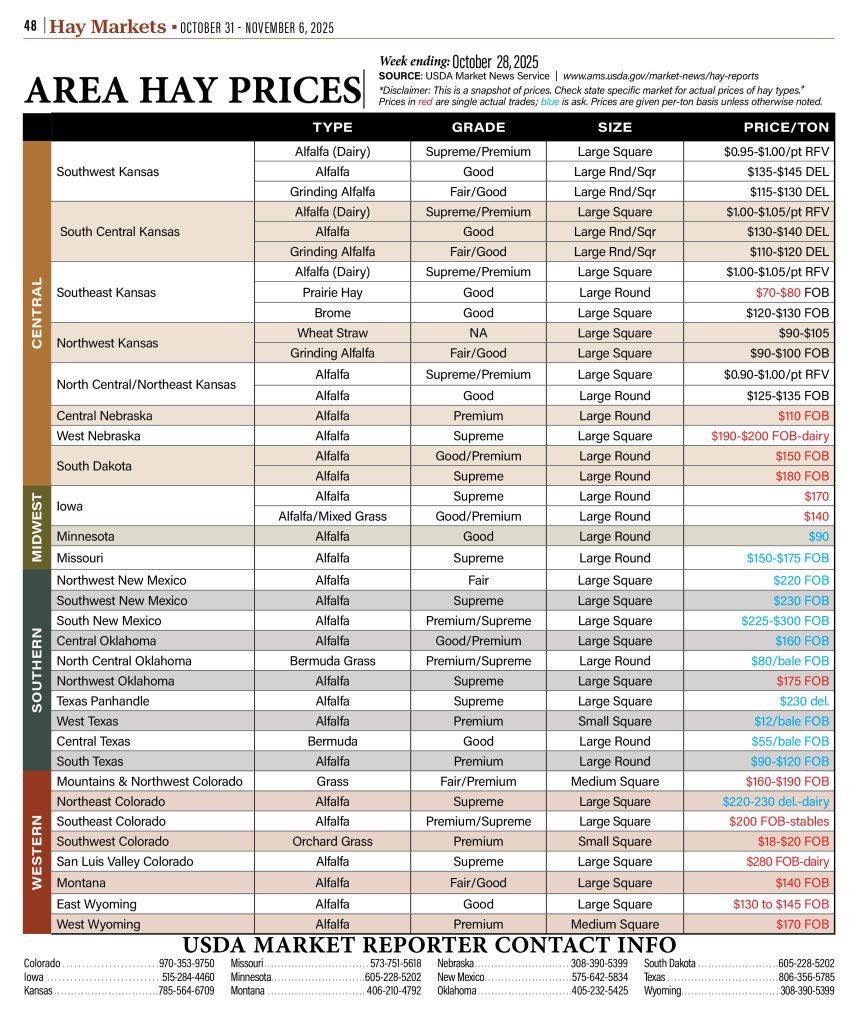Area Hay Prices, Forage Crops, Hay Market News, Hay Range Pasture, Hay Report, Markets Area Hay Prices October 25, 2025 By HPJ Staff October 30, 2025 TAGS: 3 Tie Small Square, alfalfa, area hay prices, bermuda grass, bluestem, Central Nebraska Hay, Central New Mexico Hay, Central Oklahoma Hay, Central Texas Hay, colorado hay, costal bermuda, East Wyoming Hay, fair hay, good hay, grass, grinding alfalfa, Hay delivered, hay market, Iowa Hay, kansas hay, large round bale, large square bale, meadow grass, Medium Bale, Minnesota Hay, missouri hay, Montains Northwest Colorado Hay, Montana hay, Mountains Colorado Hay, Nebraska hay, New Mexico Hay, North Central Kansas Hay, North Central Oklahoma Hay, Northeast Colorado Hay, Northwest Colorado Hay, Northwest Kansas Hay, Northwest New Mexico Hay, Northwest Oklahoma Hay, Oklahoma hay, Platte Valley Nebraska Hay, prairie grass, premium hay, San Luis Valley Colorado Hay, small square bale, South Central Kansas Hay, south dakota hay, South Hay, South Texas Hay, Southeast Colorado Hay, Southeast Kansas Hay, Southeast New Mexico Hay, Southwest Colorado Hay, Southwest Kansas Hay, Supreme hay, texas hay, Texas Panhandle Hay, timothy hay, West Texas Hay, West Wyoming Hay, wyoming hay Related Articles Area Hay Prices January 11, 2025 Area Hay Prices January 25, 2025 Area Hay Prices February 1, 2025 Area Hay Prices February 8, 2025