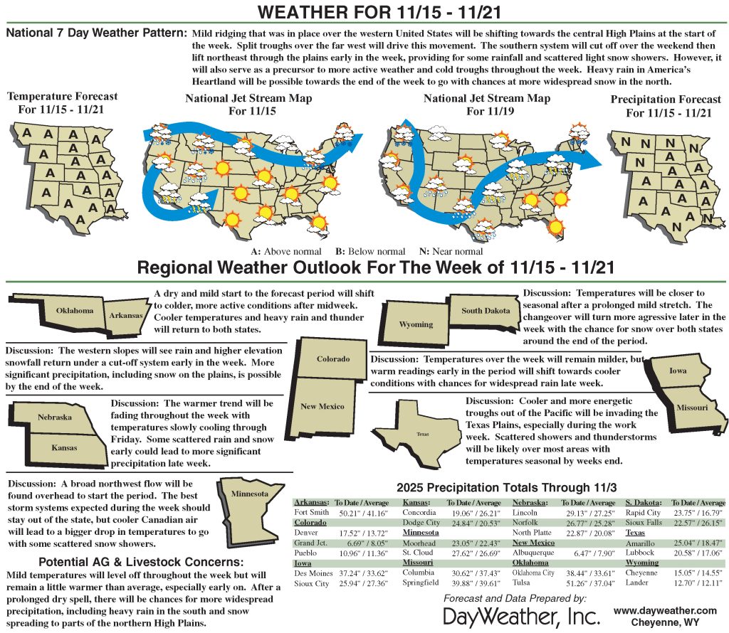 For the period from Nov. 18 to 22, the NWS Climate Prediction Center forecast favors above-normal precipitation across much of the contiguous U.S., especially from the Southwest northeastward to the Lower Ohio River Valley.