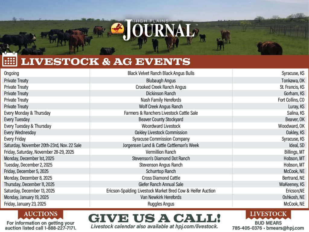 Livestock Auction Calendar, Livestock Calendar Livestock Calendar November 21 2025 By Heather Noll November 21, 2025 Listen Now 0:00 TAGS: Arkansas Weekly, Cattle Report, clovis livestock, colorado weekly, ericson livestock market, Farmers & Ranchers Livestock Commission Salina, Hub City Livestock Auction, iowa weekly, joplin regional stockyards, lexington livestock market, livestock, livestock market, Montana Weekly, ogallala livestock auction, OKC West Livestock Market, Oklahoma National Stockyards, ozarks regional stockyards, pratt livestock, Producers Livestock Auc tion, Roswell Livestock Market, Springfield Livestock Market, Tri-State Livestock Auction, tulsa stockyards, Winter Livestock, woodward livestock, Wyoming Weekly Related Articles Livestock Calendar October 31 2025 Livestock Calendar November 7 2025 Livestock Calendar November 14 2025 Livestock Auction Calendar February 16 2024