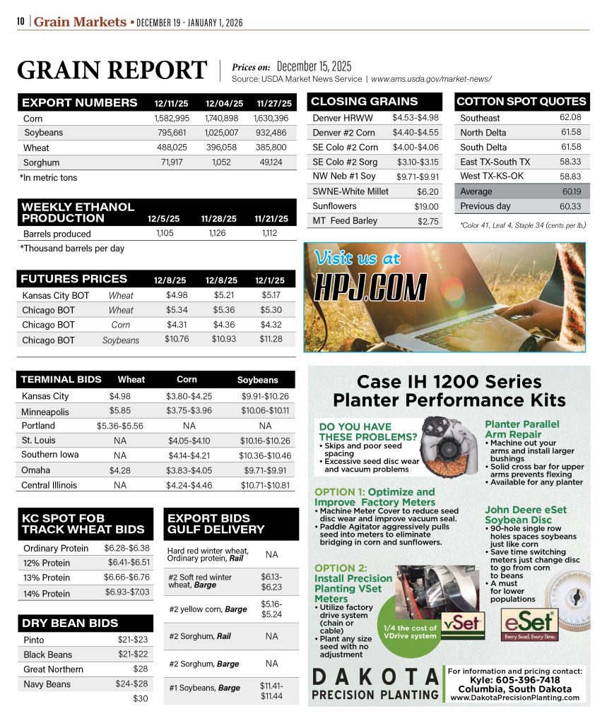 Canola, Corn, Cotton, Cotton, Crops, Dry Beans, economy, Grain Markets, Grain Report, Grain Sorghum, Markets, Other Crops, Soybeans, State Crop Reports, Sunflowers, Wheat Grain Report By HPJ Staff December 16, 2025 Listen Now 0:00 Explore More grain report Stories… TAGS: Agriculture, commerce, corn, cotton, dry beans, economics, ethanol, exports, futures, grain prices, grain report, sorghum, terminal bids, wheat Related Articles Grain Report Grain Report May 27 2025 11-17 Grain Report Grain Report