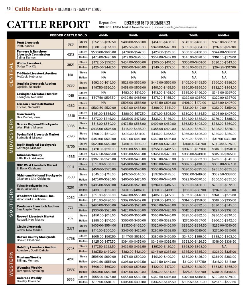 Auction Barns, beef, Cattle Report, Central Region, Feeder, Livestock, Livestock Markets, Midwestern Region, Southern Region, Western Region Cattle Markets By HPJ Staff December 17, 2025 Listen Now 0:00 Explore More Cattle Report Stories… TAGS: Agriculture, Auction Barns, cattle, Cattle Report, central, commerce, economics, heifer, prices, southern, steer, weights, western Related Articles Cattle Report Cattle Market Livestock Charts 11-21 Cattle Report