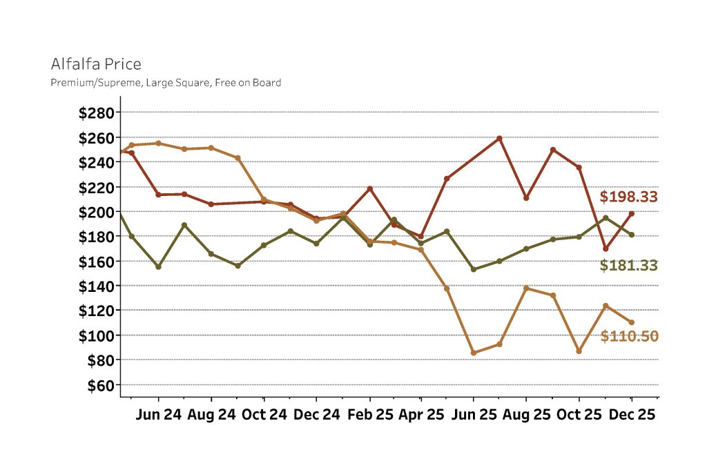 Nebraska—In the Dec. 18 report, compared to two weeks ago, all reported hay sales sold steady. Demand was mostly light instances moderate in some areas for bales of forage. Good demand for dehy and suncured pellets for regrinding into feed products. Reports of quite a lot of 2024 hay sitting around the state plus a rather large supply of 2025 hay along with several thousands bales of cornstalks. Most of the cornstalk bales are taking the excess trash off fields but are adding a surplus of roughage to a market that is already saturated with product to market. Some livestock owners are supplementing feeding in the cold snap this month, but overall tonnage fed has been quite a lot less for most Decembers compared to previous years. The next report release will be on Jan. 15.